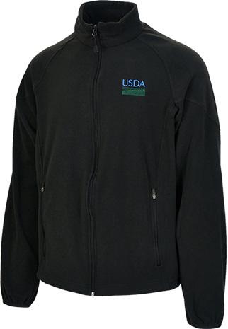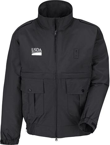 Breathable Waterproof Coating with Windproof, Waterproof breathable membrane, zip out Prima Loft liner two way zipper with internal storm flap, tunnel collar, Elastic extending ¾ around waist with side access zippers, elastic cuffs, concealed front pockets Color: Black Heat Transfer USDA Logo