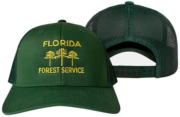 Baseball cap, fitted, medium profile, forest green, 6 panel, lightweight moisture-wicking, flexfit, twill. Embroidered Florida Forest Service logo in yellow. Optional name in ALL CAPITAL LETTERS embroidered on rear of hat.