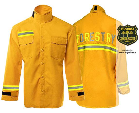 Agriculture & Consumer Services patch sewn on each sleeve, Certified Firefighter patch sewn on the left chest, and the letters “FFS” embroidered in green on each collar. For optional nametapes sewn on shirt, please specify first initial AND last name after adding to your cart. To purchase a nameplate please order item FL146.