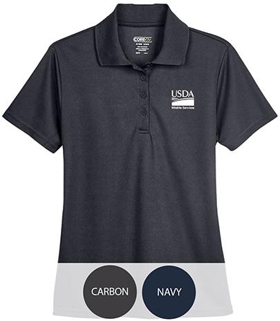 Unisex Short Sleeve Performance Polo with Left Chest Pocket 100% Polyester 4.1oz fabric, moisture wicking, antimicrobial and UV protection performance, matching flat knit collar, three button placket, side slits. Colors: Carbon, Navy Embroidered USDA Logo Left Chest