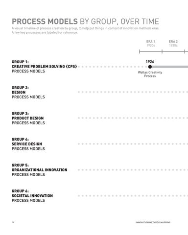 PROCESS MODELS BY GROUP, OVER TIME A visual timeline of process creation by group, to help put things in context of innovation methods eras. A few key processes are labeled for reference. ERA 1 1920s