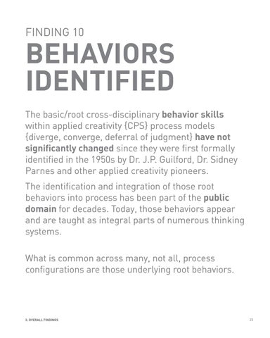 BEHAVIORS IDENTIFIED The basic/root cross-disciplinary behavior skills within applied creativity {CPS} process models {diverge, converge, deferral of judgment} have not significantly changed since they were first formally identified in the 1950s by Dr. J.P. Guilford, Dr. Sidney Parnes and other applied creativity pioneers. The identification and integration of those root behaviors into process has been part of the public domain for decades. Today, those behaviors appear and are taught as integral parts of numerous thinking systems. What is common across many, not all, process configurations are those underlying root behaviors.