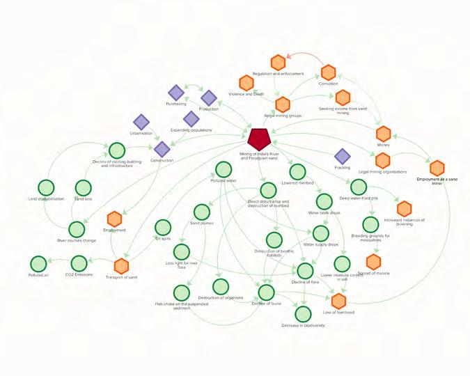 ´ Causal map developed by Alice Wassell, Elle Chotiwanich, Namratha Ashok and Bhargavi Boyina for their topic, “The Sand Crisis: The Mining of Riverine and Floodplain Sand Within India.”