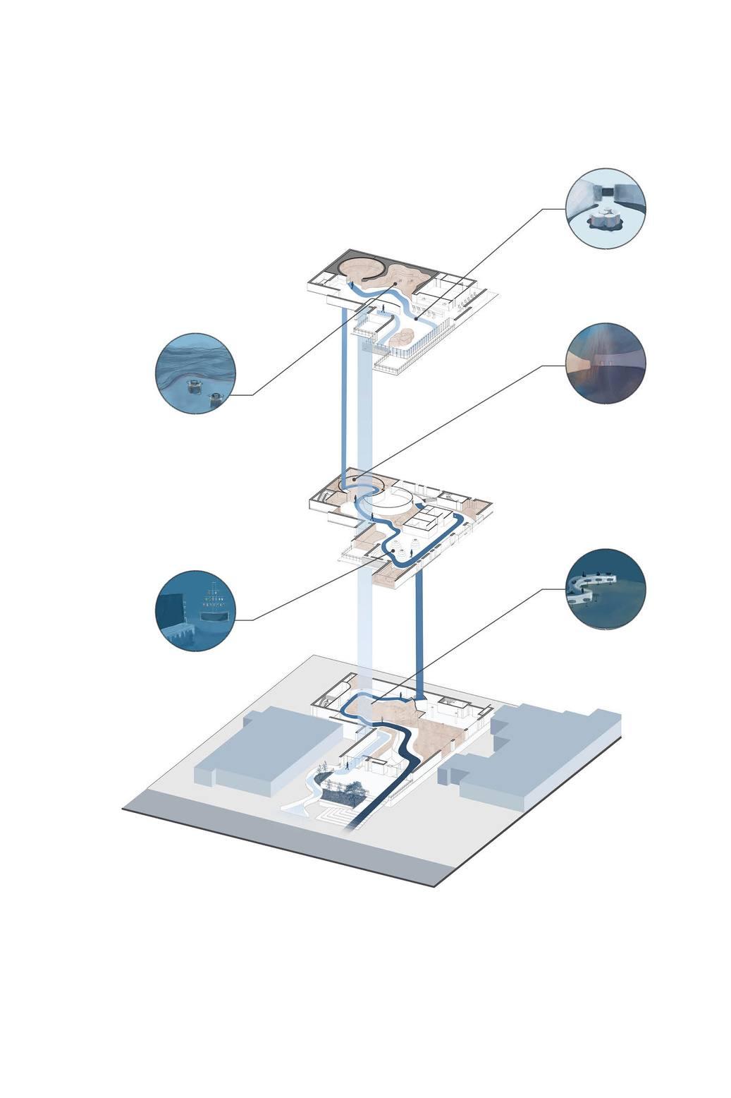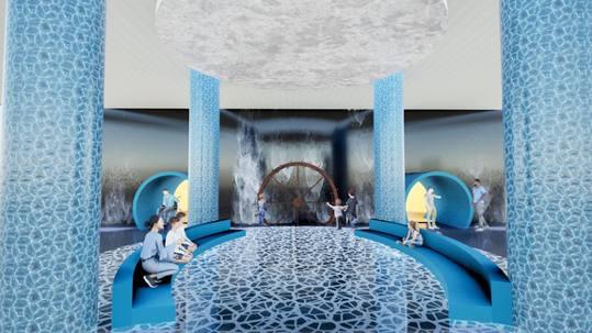 The Hydro Power Pod design creates an immersive underwater experience as visitors enter The space is divided by a partition leading into the main area, which mimicsthefunction ofa dam, with cascading water and turbine movement capturing energyNarrow pools ofwater along the perimeter of the pod visually connect visitors to the water below, reinforcing the relationship between the water sourceandtheenergyit provides.