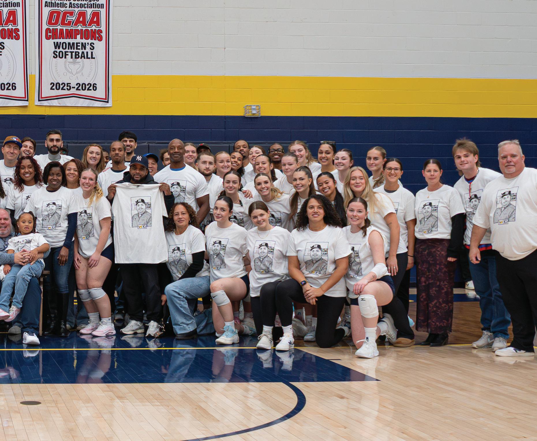 Men’s head coach Wayne Wilkins gathered with his family after the men’s game, including his brother Chris Wilkins, who coaches the women’s team. Players and alumni in attendance wore T-shirts featuring his face to highlight his 30th season with the Hawks.
