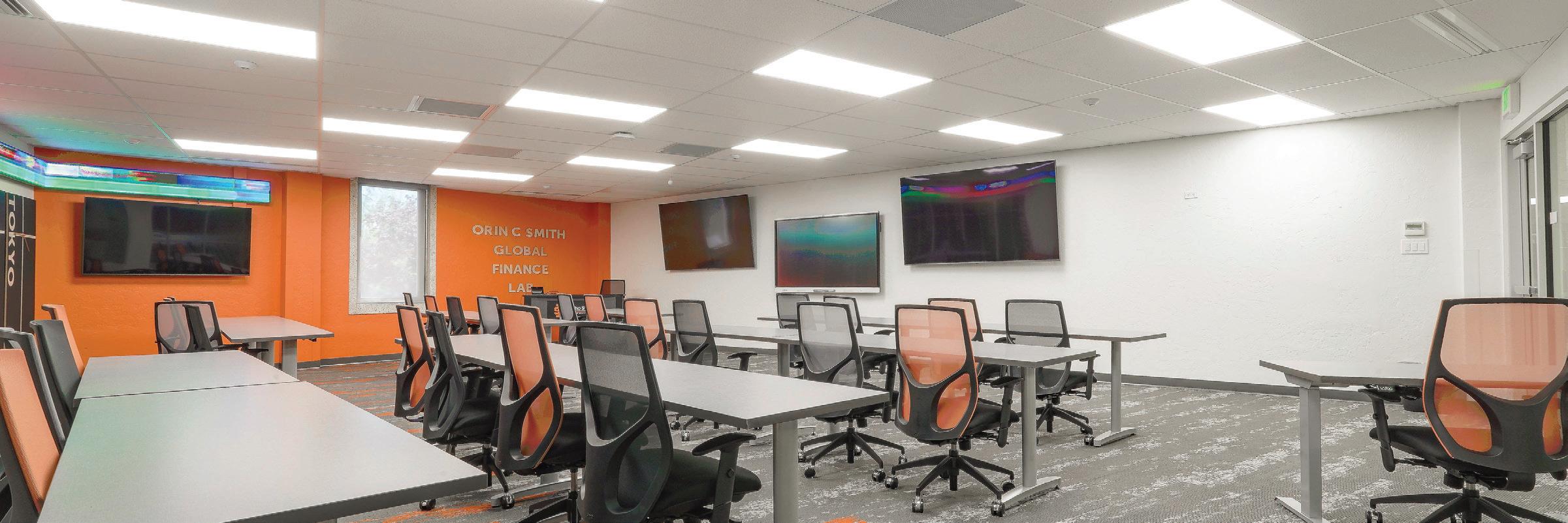 The Walter P. Brown Center for Sales Excellence contains a small classroom for the Advanced Sales Classes, a room where students can record sales role-plays or have professional Zoom interviews, and an area for sales training. The Orin C. Smith Global Finance Lab offers COB students and faculty a modern, trading room-inspired environment to learn and apply the latest financial tools and analytics in high demand.
