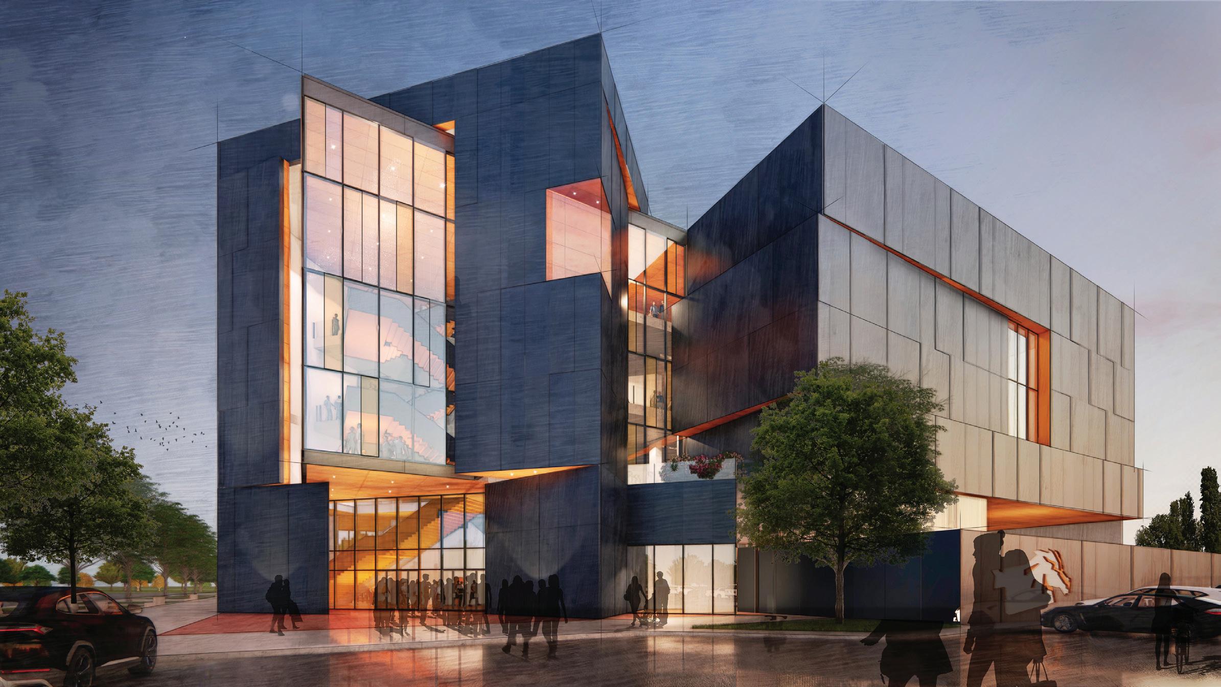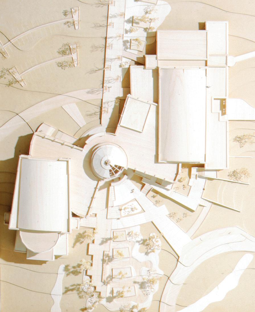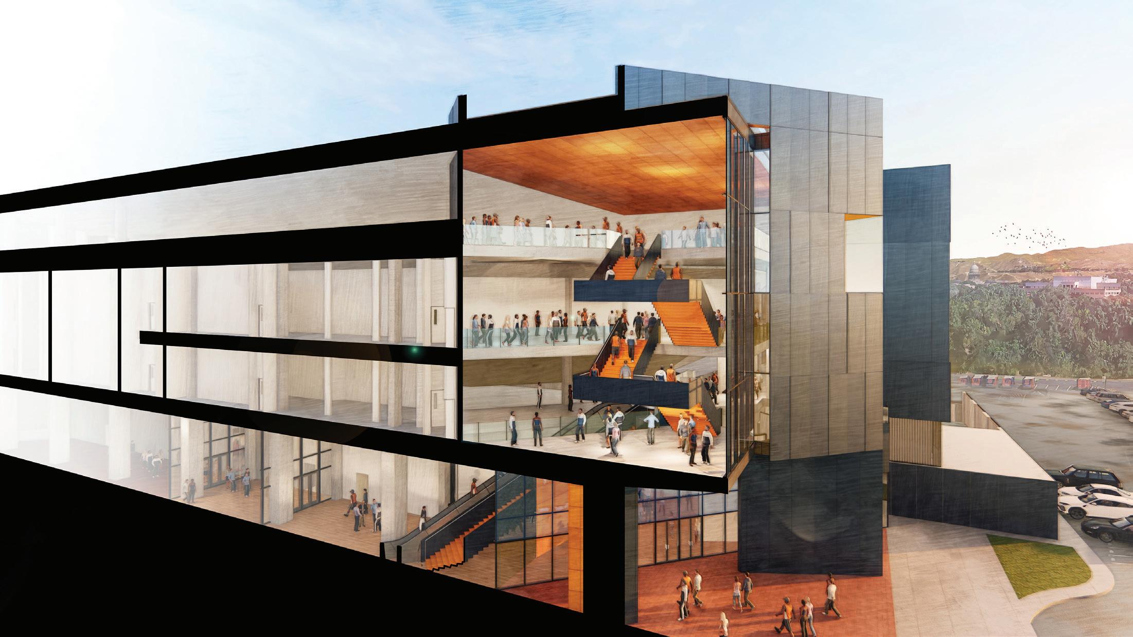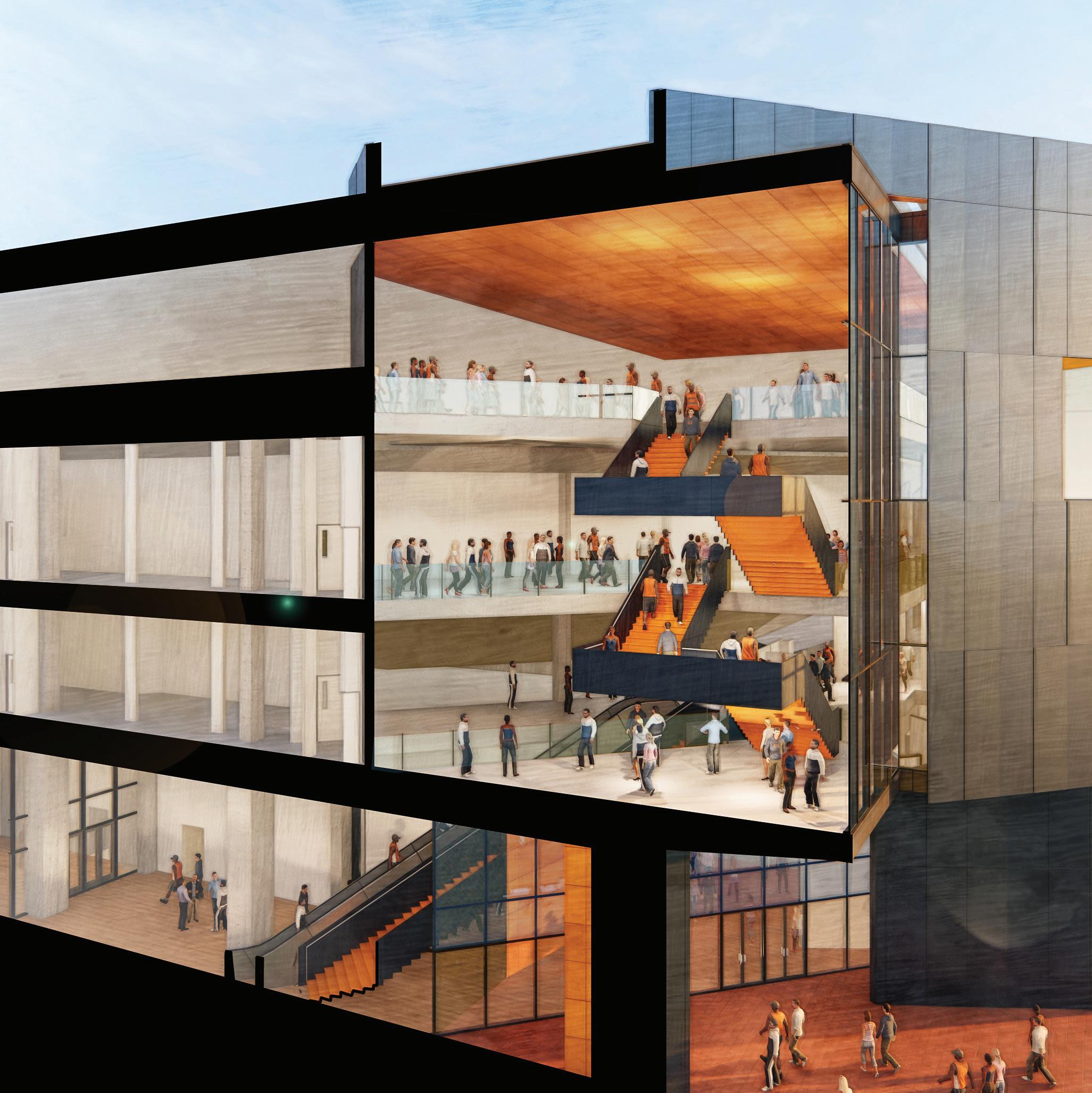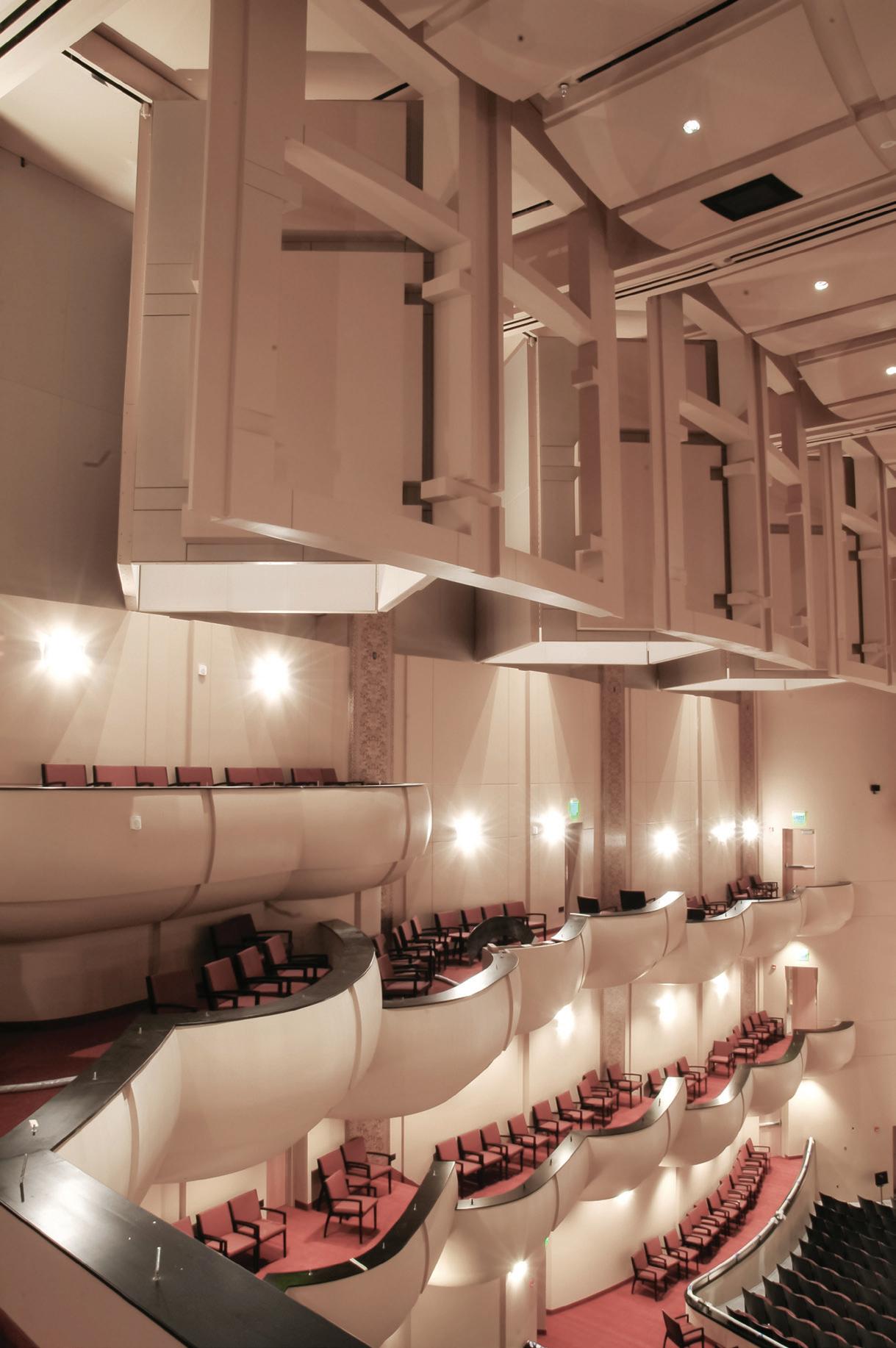 Promenades serve as spoke-like circulation paths leading from the lobby to the various performance venues. The Performing Arts Center includes a 1,200-seat concert hall, a 450-seat thrust theater, and a 200-seat experimental, black box theater.