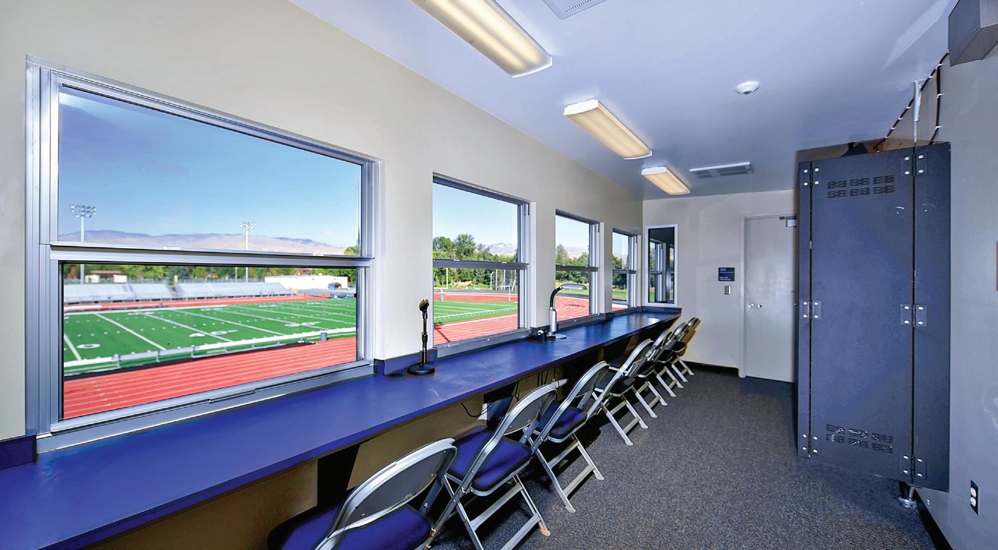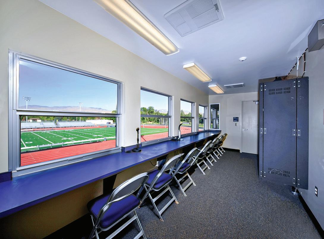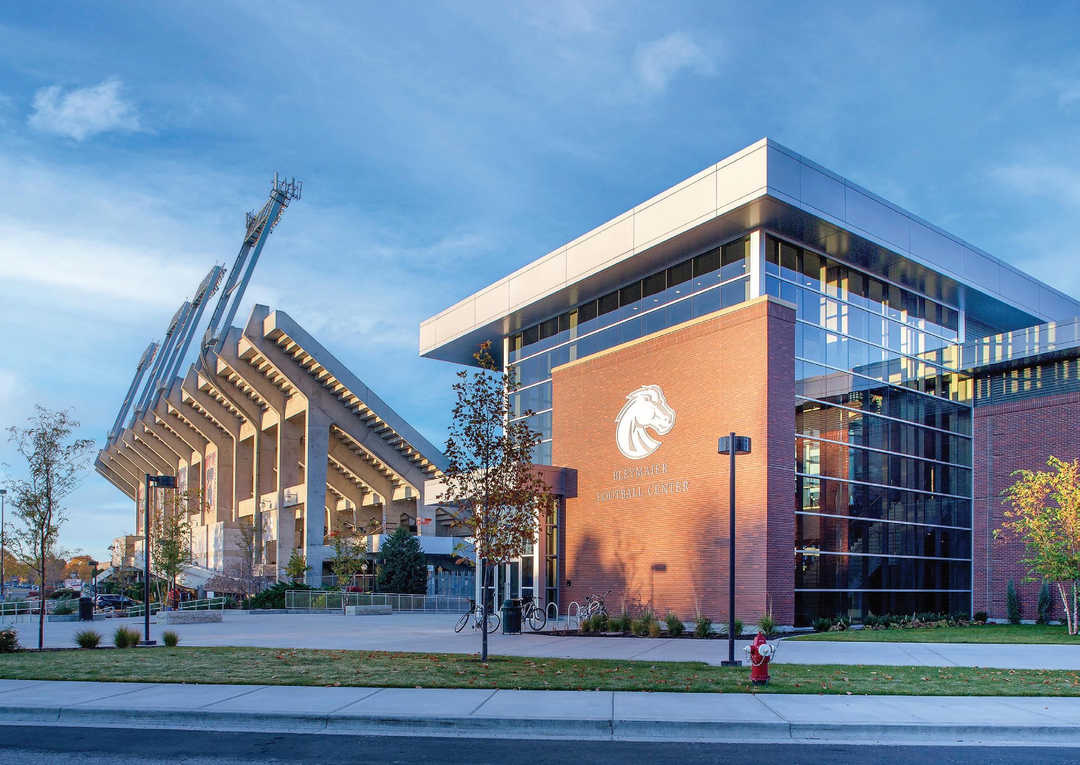 The football training facility is located in the endzone of Albertsons Stadium featuring nearly 70,000 GSF of program including the team locker room, player lounge, weight room, athletic training, coaches offices, meeting rooms, and a recruiting lounge with views into the stadium. The design team planned for future stadium expansion over the training facility building including sizing columns within the footprint to handle the anticipated phase-two project.