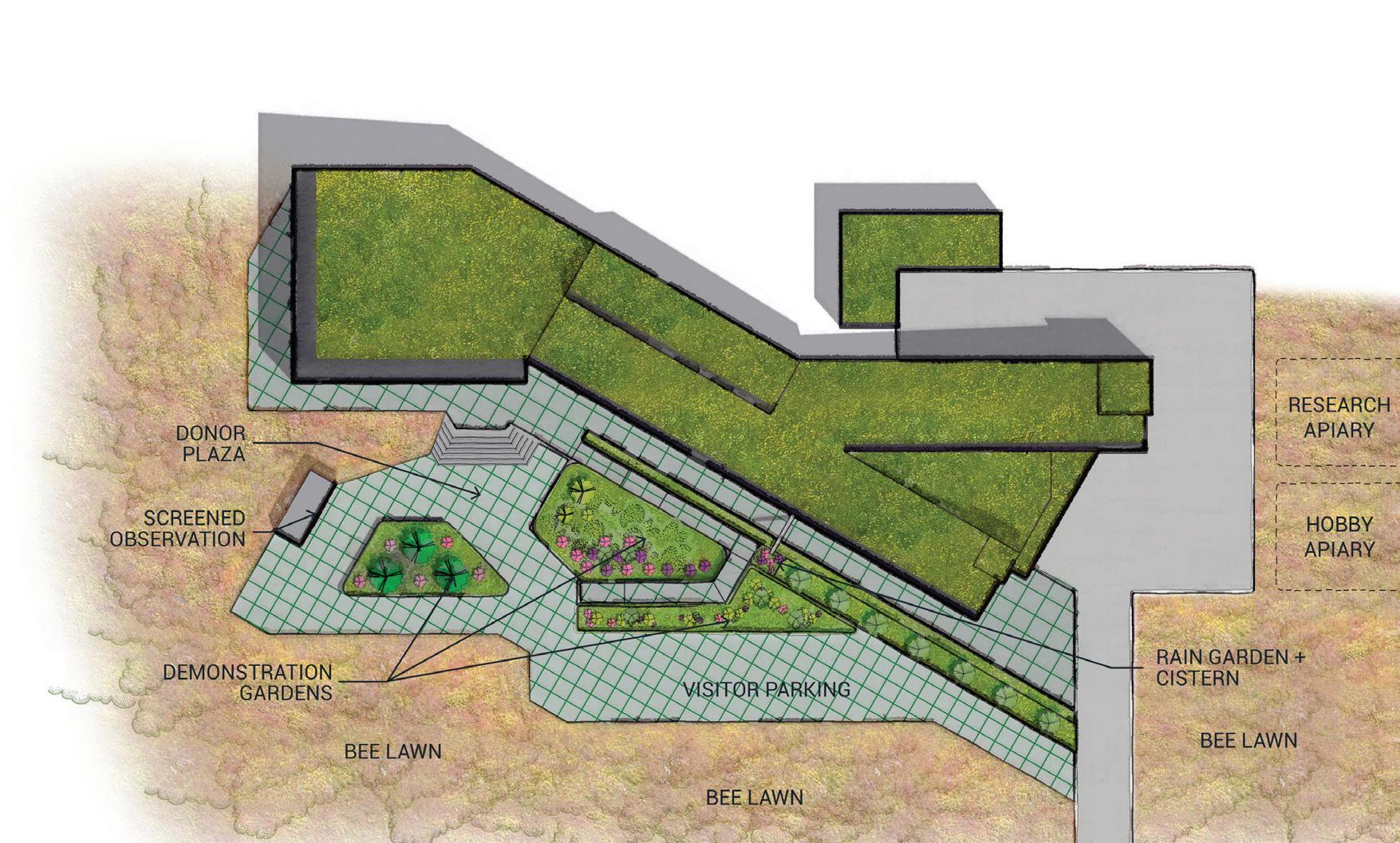 The WSU Honey Bee and Pollinator Research Facility will be ideally situated adjacent to the Eggbert Family Organic Farm in the rolling hills of campus. Acreage will be provided for forage and nutritional studies. Demonstration gardens and apiaries are designed to promote understanding and inform the public about pollinator health. This global center of innovative research and education will be accessible to scientists and beekeepers from around the world and the United States.