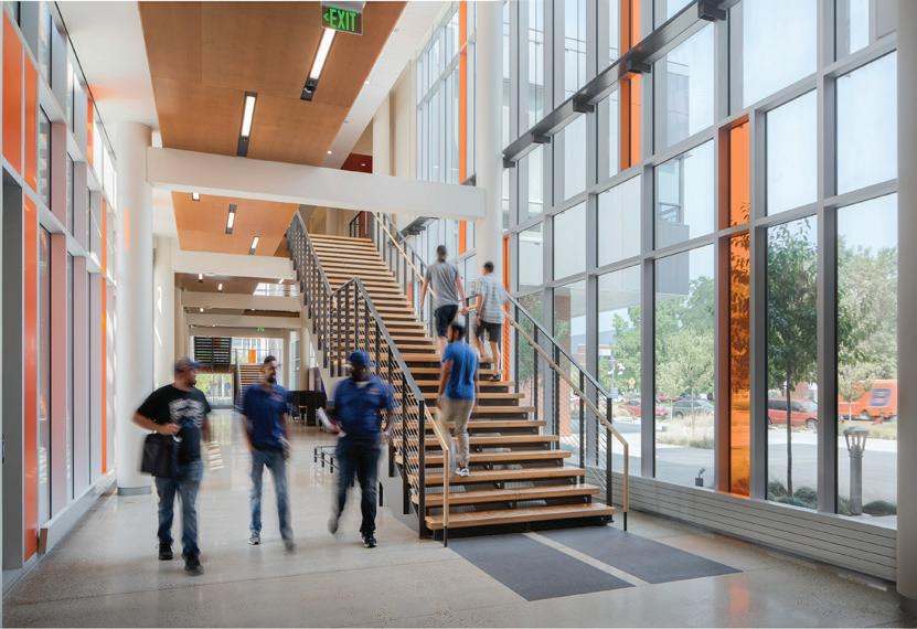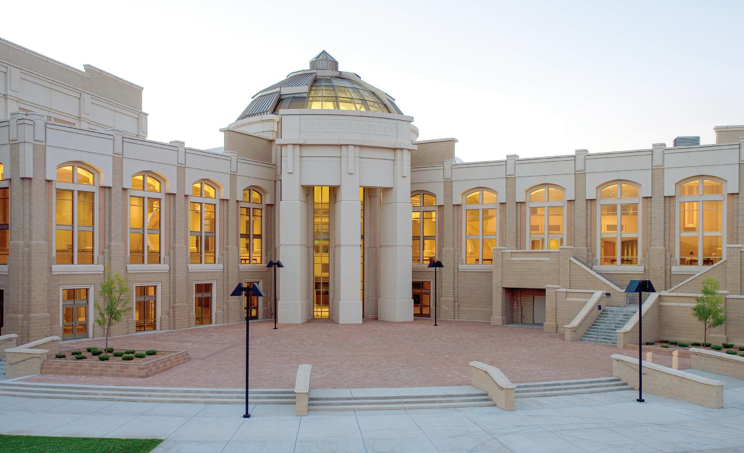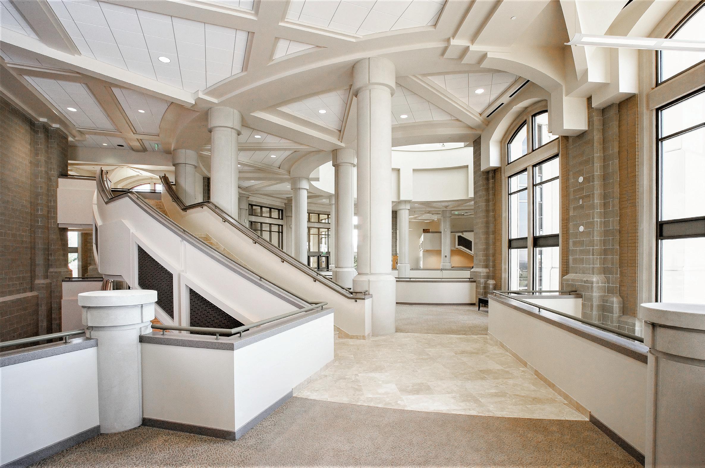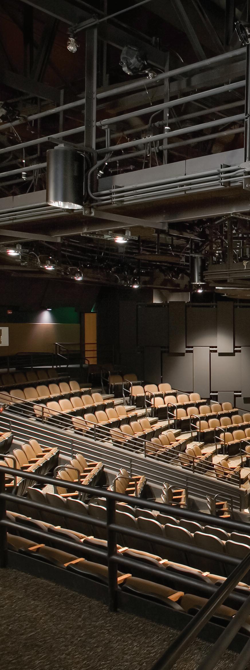 Designed using traditional architectural elements and constructed from integral-colored CMU block, precast concrete, and brick construction, the Stephens Performing Arts Center’s hub-andspoke design radiates from a large rotunda lobby offering an ideal space for pre-performance gatherings. The rotunda is accessed by two main entrances, one overlooking the ISU campus and the other facing Scout Mountain.