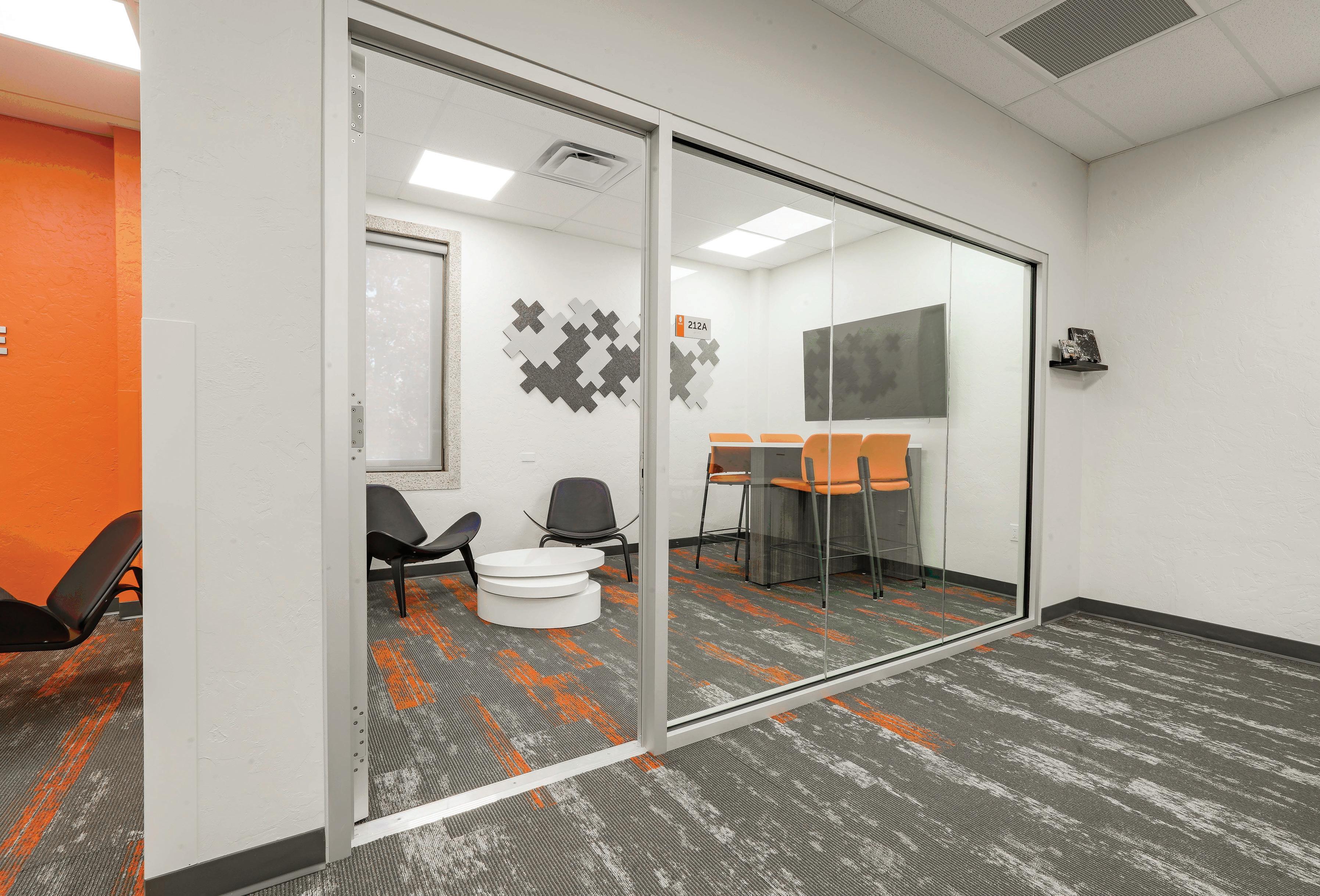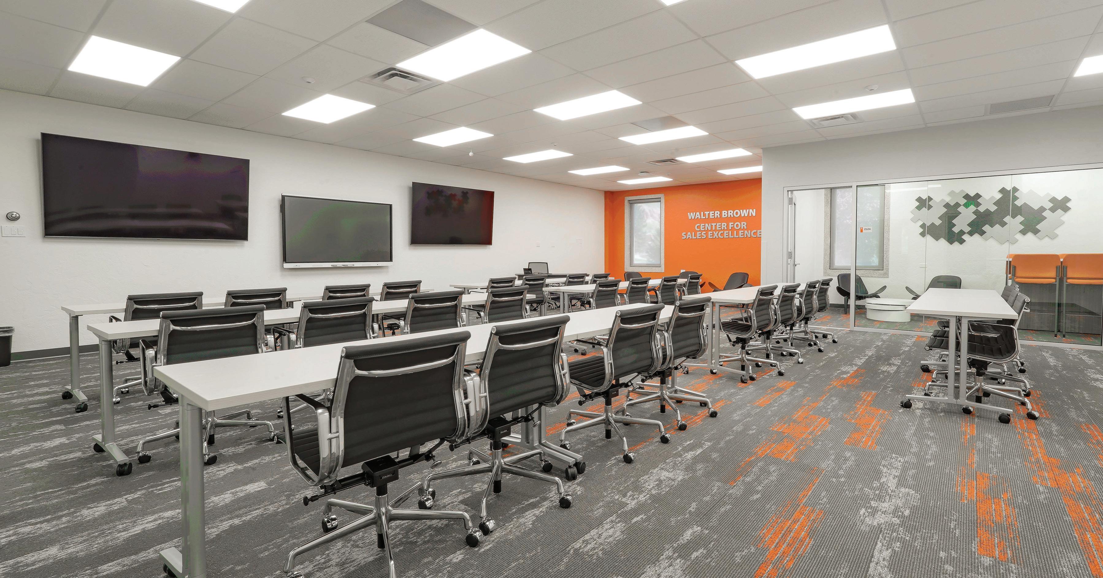 The Walter P. Brown Center for Sales Excellence contains a small classroom for the Advanced Sales Classes, a room where students can record sales role-plays or have professional Zoom interviews with employers from out of town, and an area for sales training available to the community.