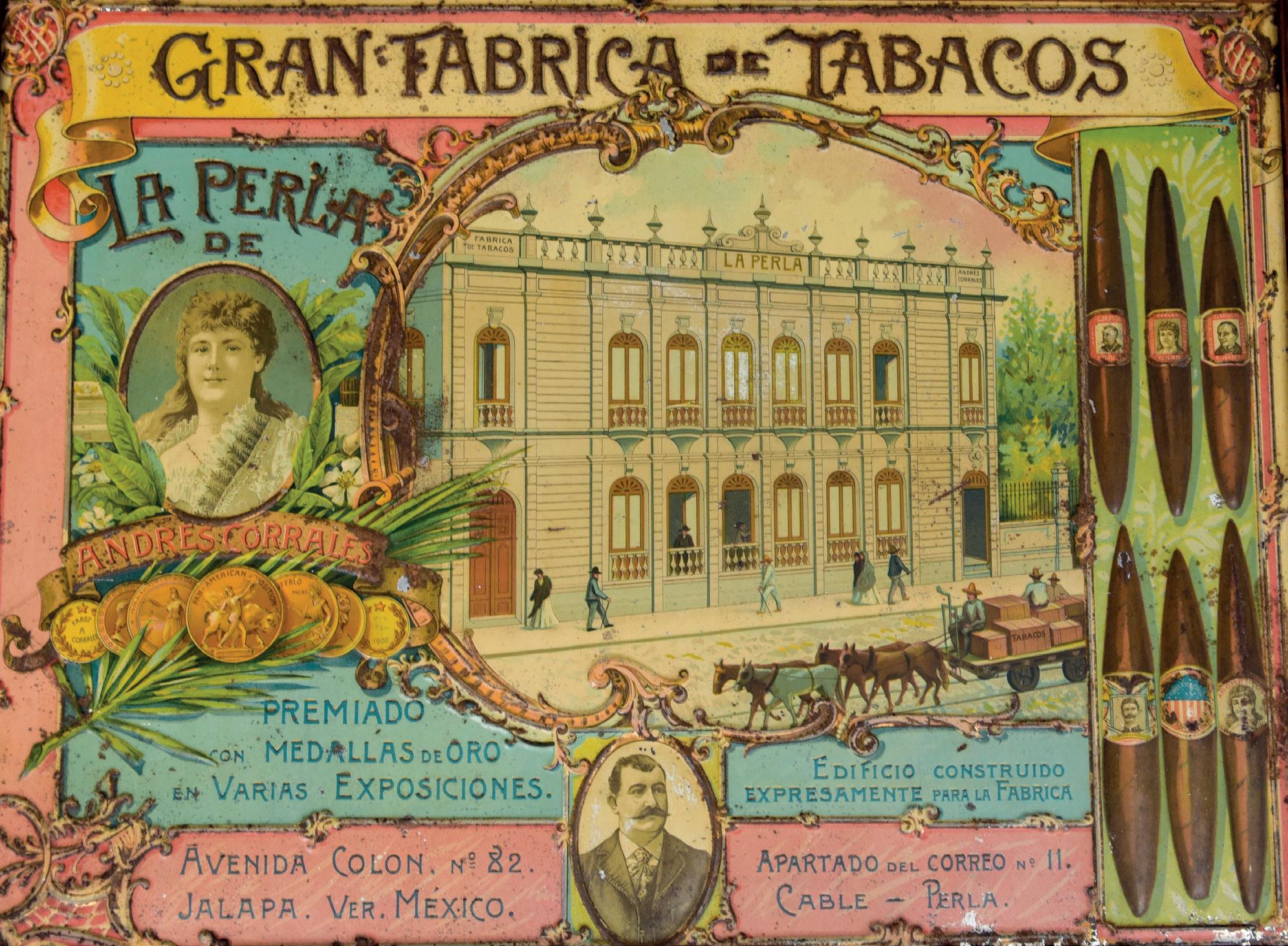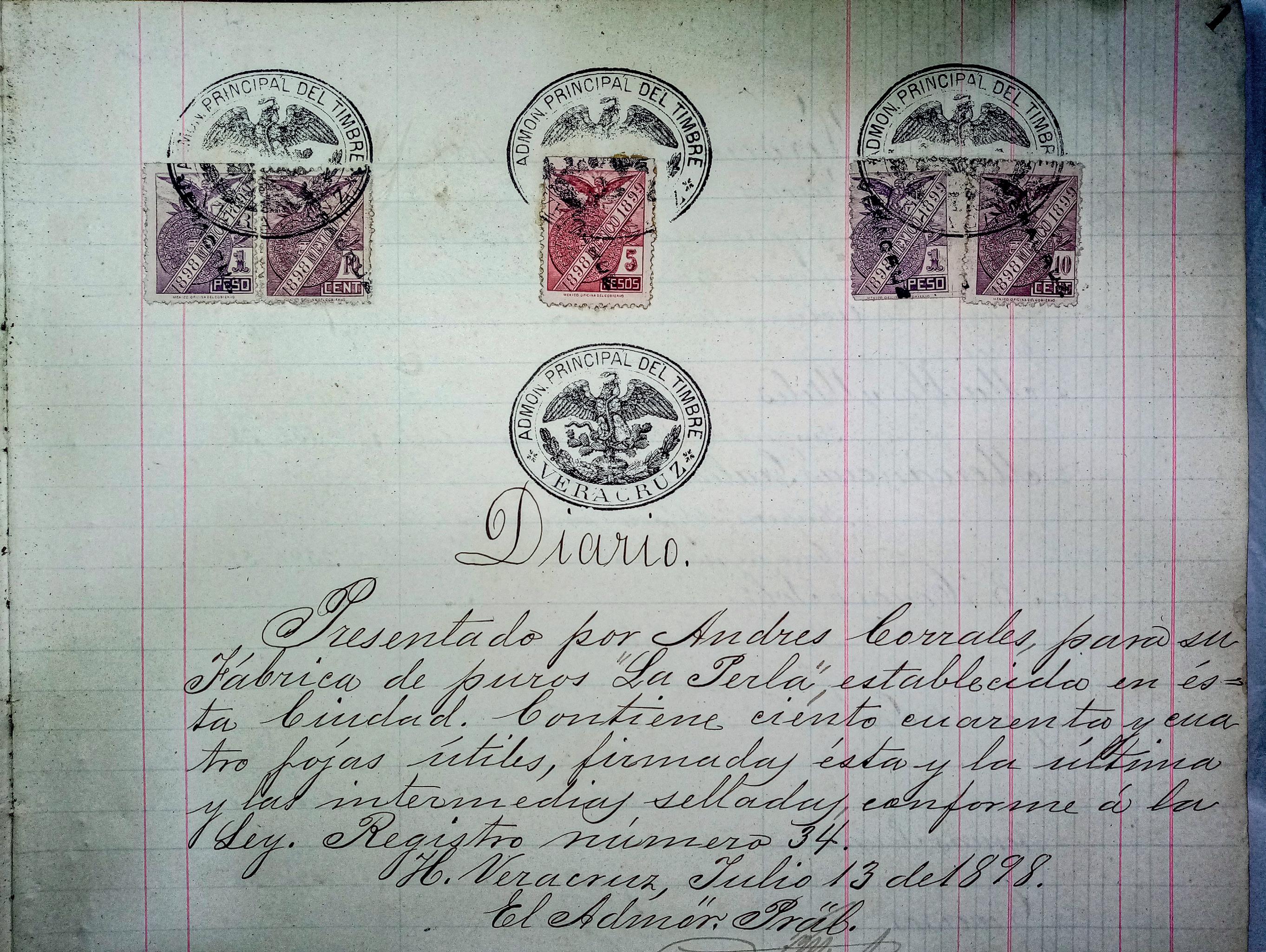 El 12 de mayo de 1898, el administrador principal de la Renta del Timbre en Veracruz certificó el registro número 155, correspondiente a la fábrica de tabaco de puros de perilla La Perla, de Andrés Corrales Corrales, establecida en la calle 5 de Mayo núm. 55 de la ciudad y puerto de Veracruz. Dos meses después se presentó ante la misma instancia el Libro Diario, con timbres por un valor de 7.11 pesos y 144 fojas útiles, selladas y firmadas, para administración de la empresa.