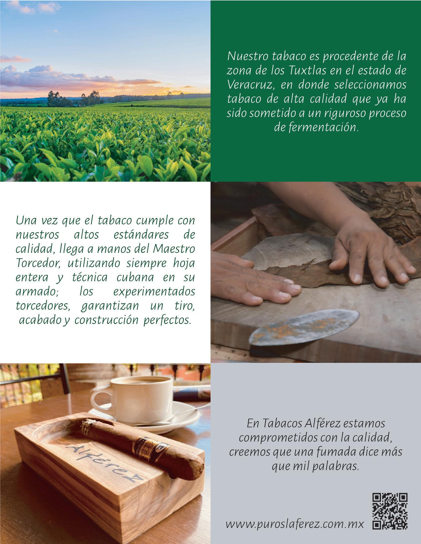 únicas y excepcionales La subasta inicial de Habanos Day México COBERTURA ESPECIAL INTERNACIONAL TRADE SHOW PCA 2023 La Feria Mundial del tabaco premium –Segunda parte–Cigarros Dos Jotas 52 Celebración de la dominicanidad Serafín de Cuba 56 El sabor de Yvor City Compadres Cigars 60 Nada es imposible José Blanco 68 La cátedra de El Profesor Manuel Inoa 72 El arte del blend en La Aurora Yaniv Erez 82 Un hombre de negocios diferente Kelner Cigars 86 Amor y pasión por el tabaco HERMANDAD DE LA HOJA SOTL GLOBAL MOVEMENT Toman por asalto Baltimore y DC 94 Las empresarias encienden el camino Leonor Abzaradel 102 La sonrisa de Cigar Blondie SMOKING GARDEN CLUB APUNTES DE UN NOVATO 112 Manual del Cortapalos para fumadores de pipa FRANCISCO REUSSER FRANK PIPE REVIEW 122 La mezcla de la Revolución CHRISTOPHER SÁEZ AHUMADA MUNDO DE TABACO HACIENDO AMIGOS 132 INTERNACIONAL La Llave del Universo FERNANDO SANFIEL NOVELA POR ENTREGAS 140 Forajidos, Historias de tabaco en el viejo oeste Capítulo 5: Venganza Parte I: Cabalgata RAÚL MELO