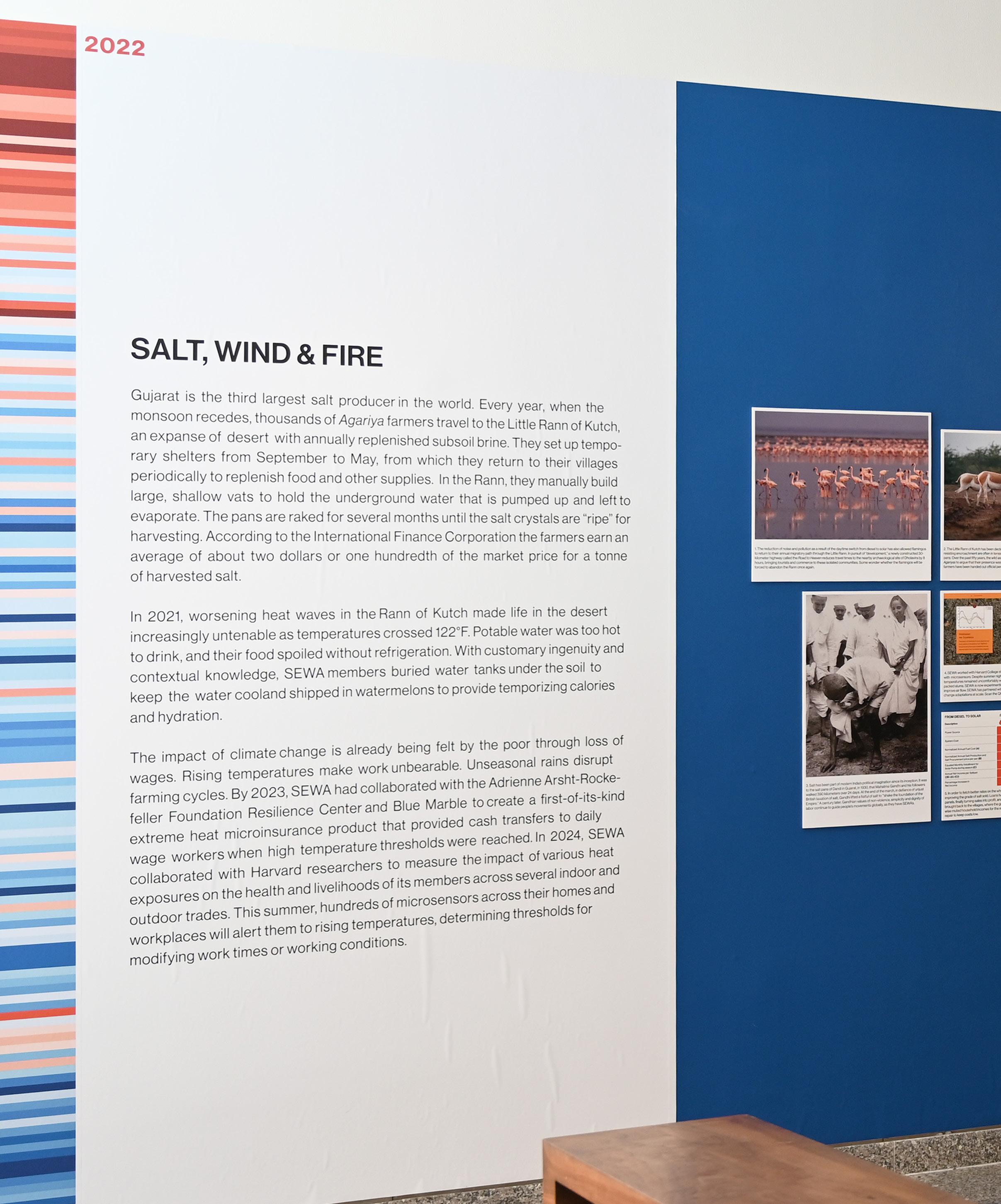 Media: 3 Photographs; a Comparison of Costs table by the Natural Resources Defense Council; Community HATS Project; 2 Videos: ‘Jamnaben Amarsinh Raking Salt, Surendranagar Salt Pans’ and ‘Cleaner Skies, Gujarat’; a Screen showcasing real-time temperature in the Rann of Kutch; and Climate Stripes visually representing the changes in temperatures in Gujarat since 1874.”