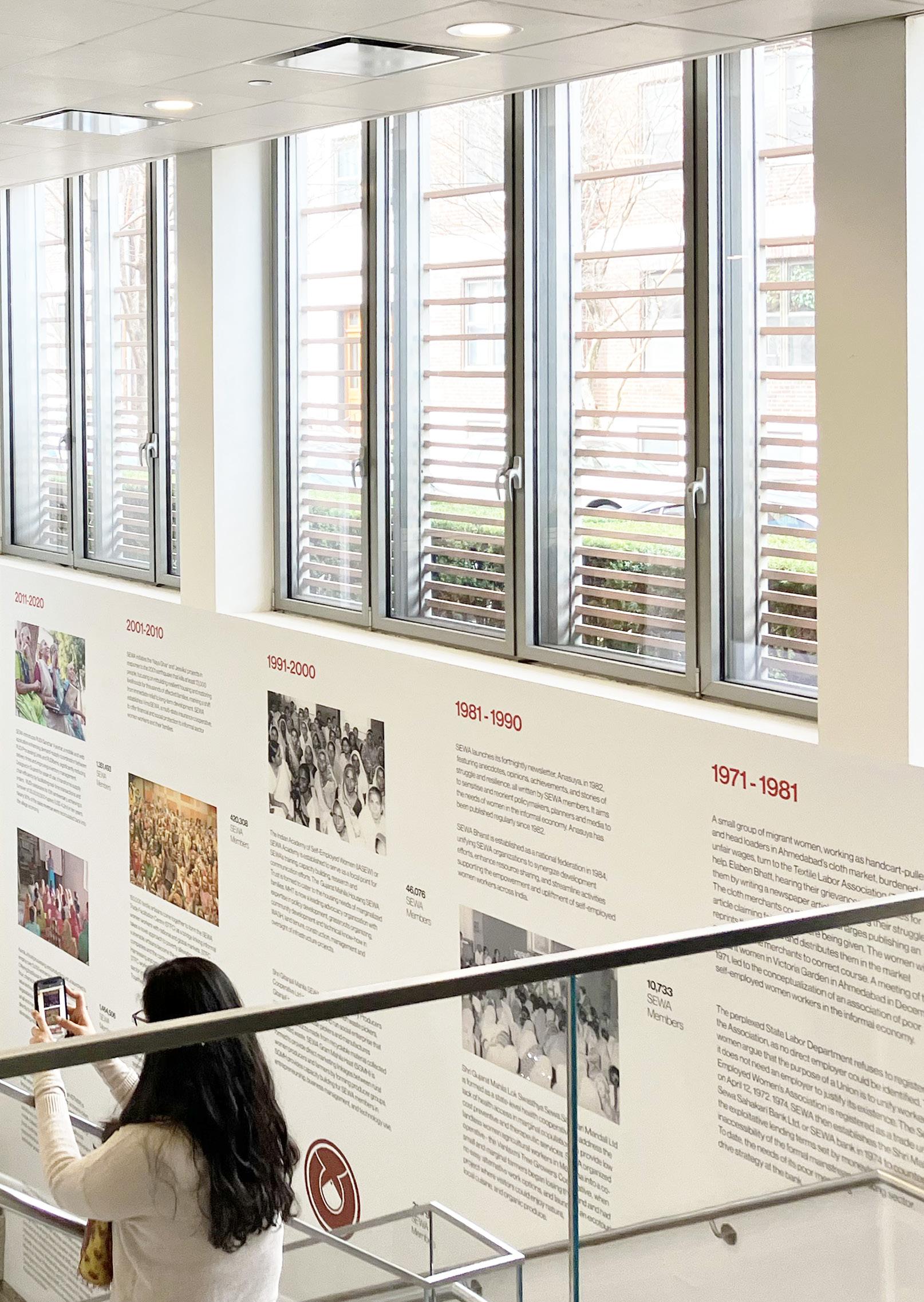 Media: A vinyl timeline documenting 5 decades of SEWA, representing key milestones and the increase in membership, which can be reprinted on khadi or digitized for modularity.