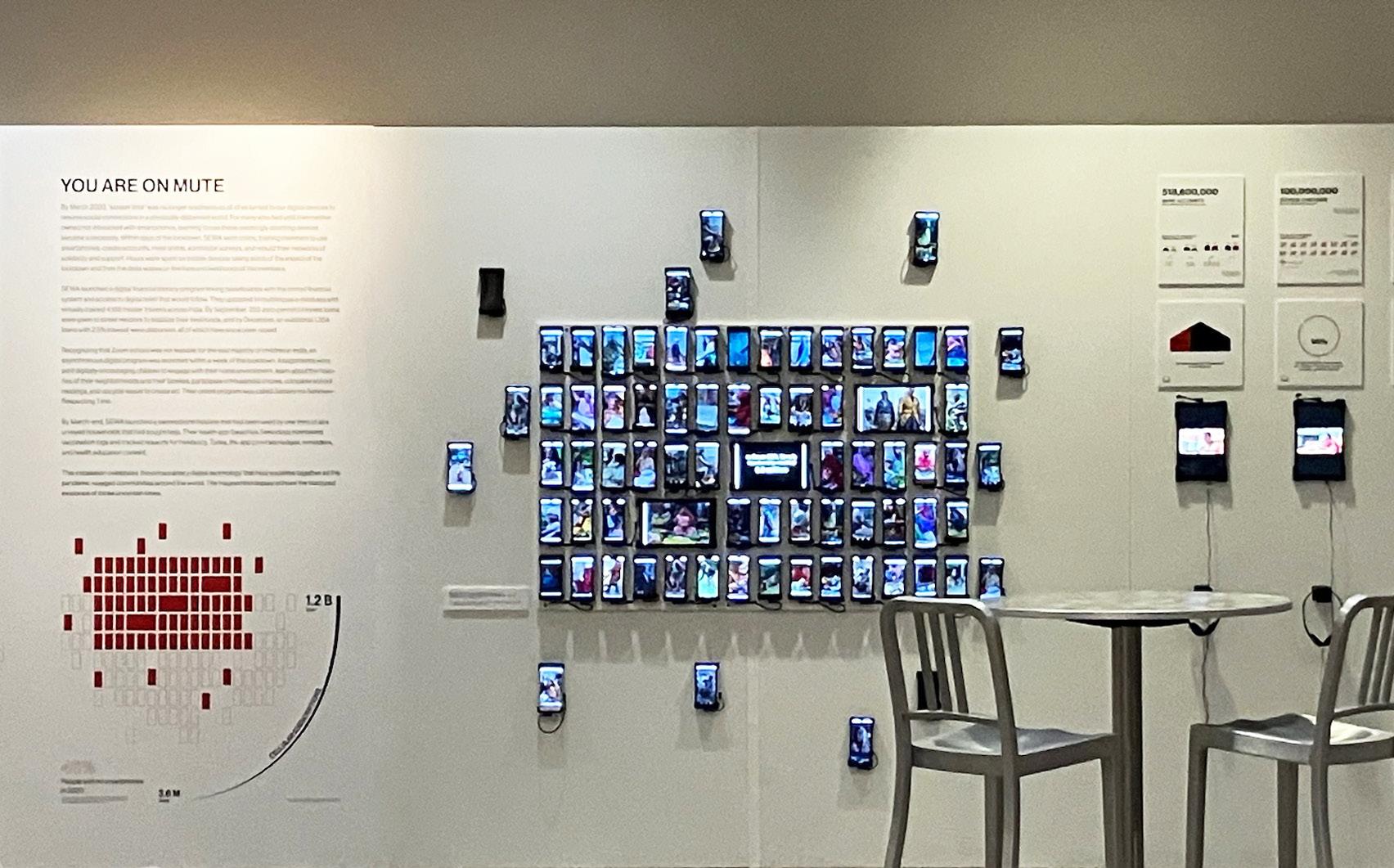 This installation celebrates the extrordinary digital technology that held societies together as the pandemic ravaged communities around the world. The fragmented display echoes the fractured existence of those uncertain times.