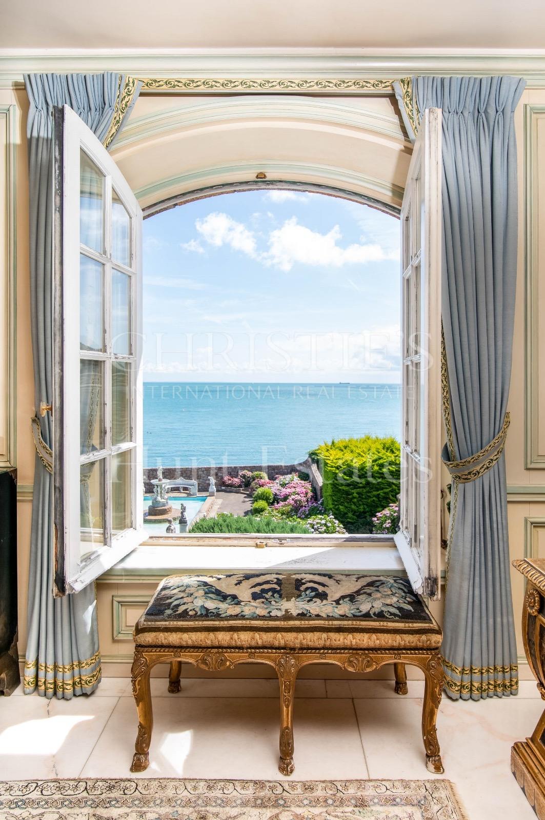 Approached through a traditional granite archway from the coastal road, one is greeted by a sweeping shrub-lined driveway. Upon arrival at the circular drive, the residence is entered through a grand hall that features a sweeping marble staircase leading to a spacious light filled landing. The ground floor has a drawing room to the right of the hall that seamlessly transitions to a library, forming an impressive, combined length exceeding 40 feet. The drawing room includes a grand open stone fireplace and access to a terrace. To the left of the hall there is a large dining room that also opens onto the same terrace, which affords breathtaking uninterrupted sea views. Notably, an expansive 30-foot extension can serve as a cinema or TV room or be dedicated to showcasing cherished collections. The kitchen, with a central island and breakfast nook, as well as a utility room, complete the main floor.