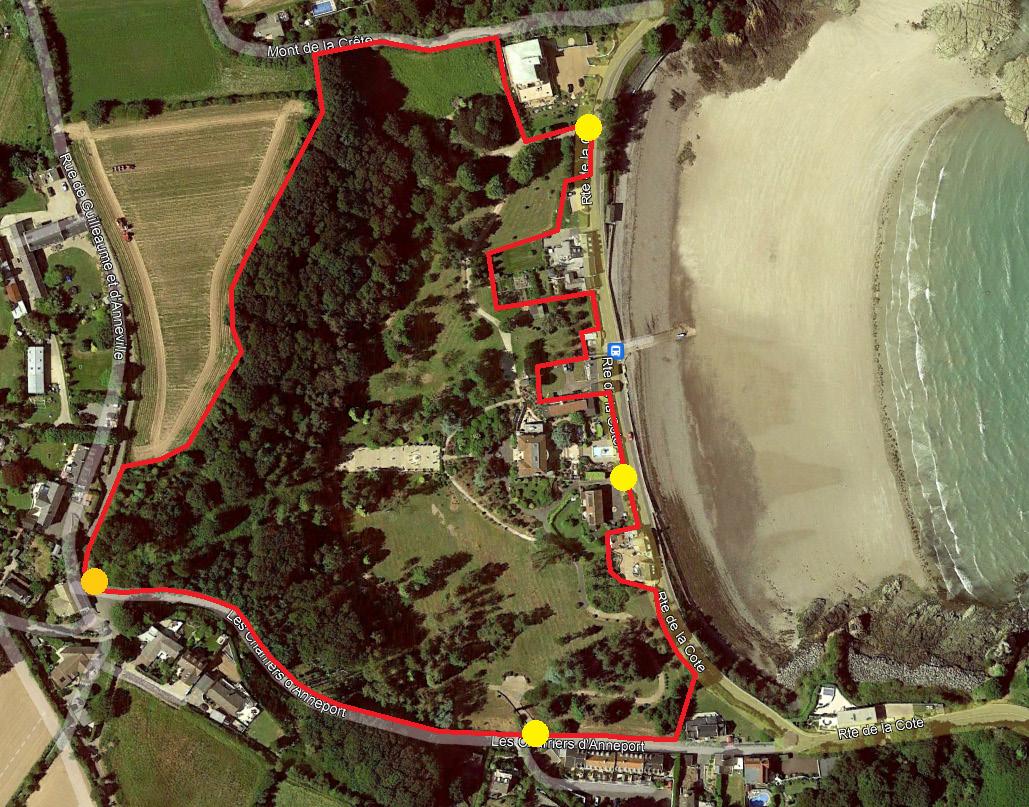The expansive 16-acre estate enveloping the residence spans across the whole of the bay and blends into the wooded cotils on its western edge. Though a few privately owned properties punctuate the land, they pose no intrusion to its privacy. The estate comprises beautiful gardens, grassy slopes, and woodland, organised into four fields marked as unconditional and environmental (woodland) designations. The fourth field, spanning 1.5 vergees and situated behind the Moonraker apartments, is typically used for potato cultivation.
