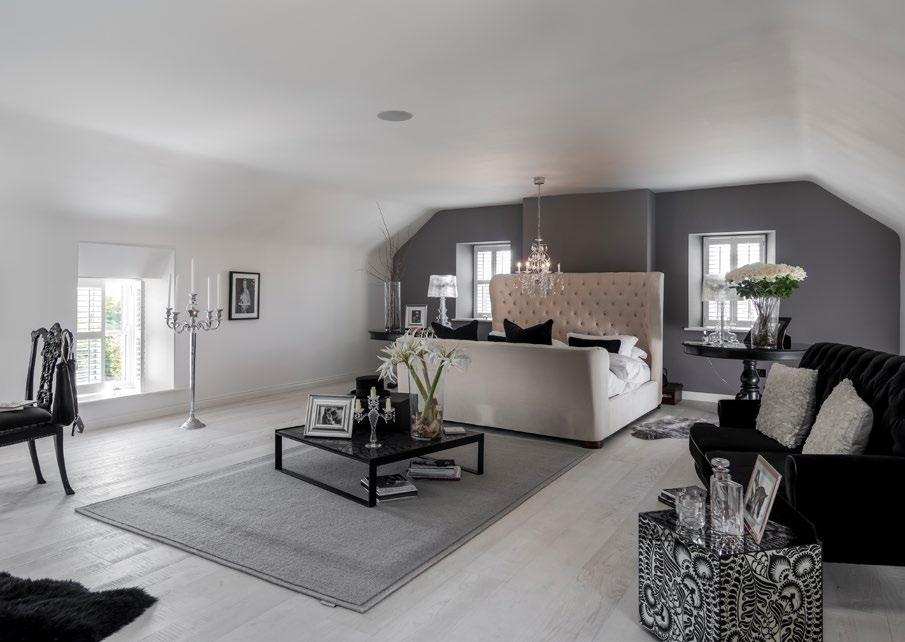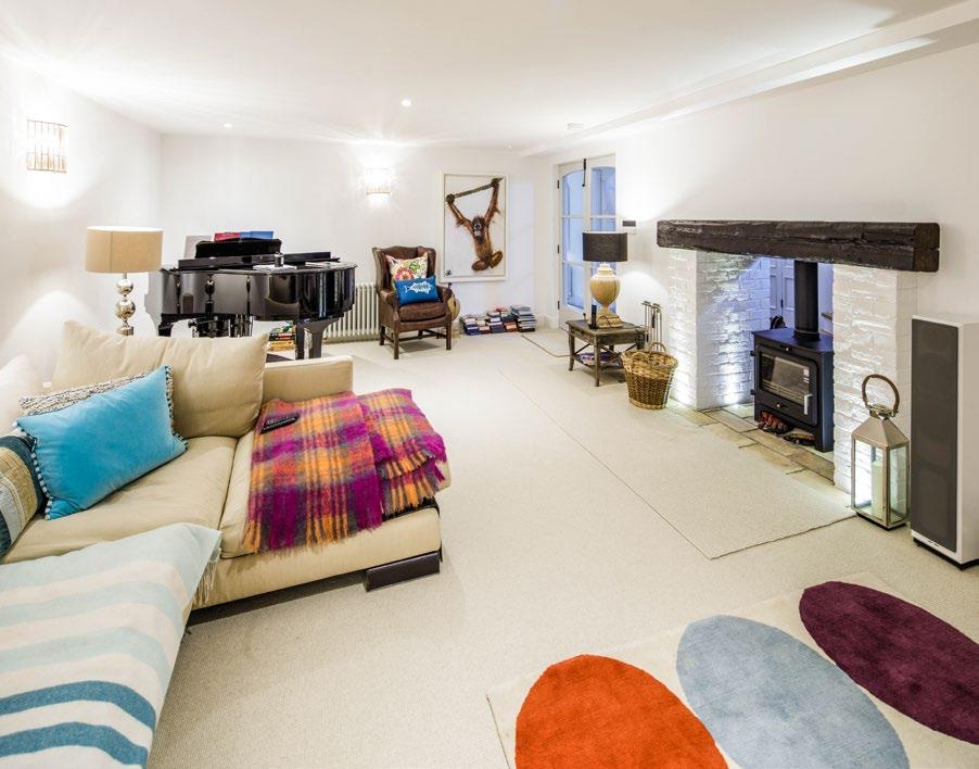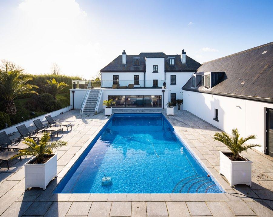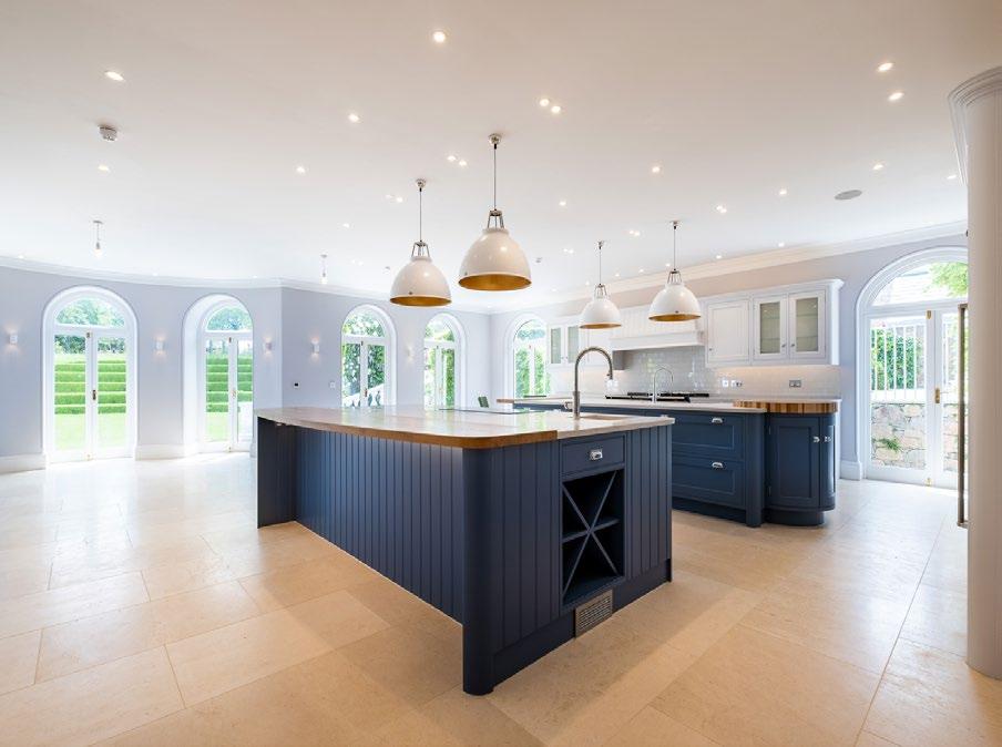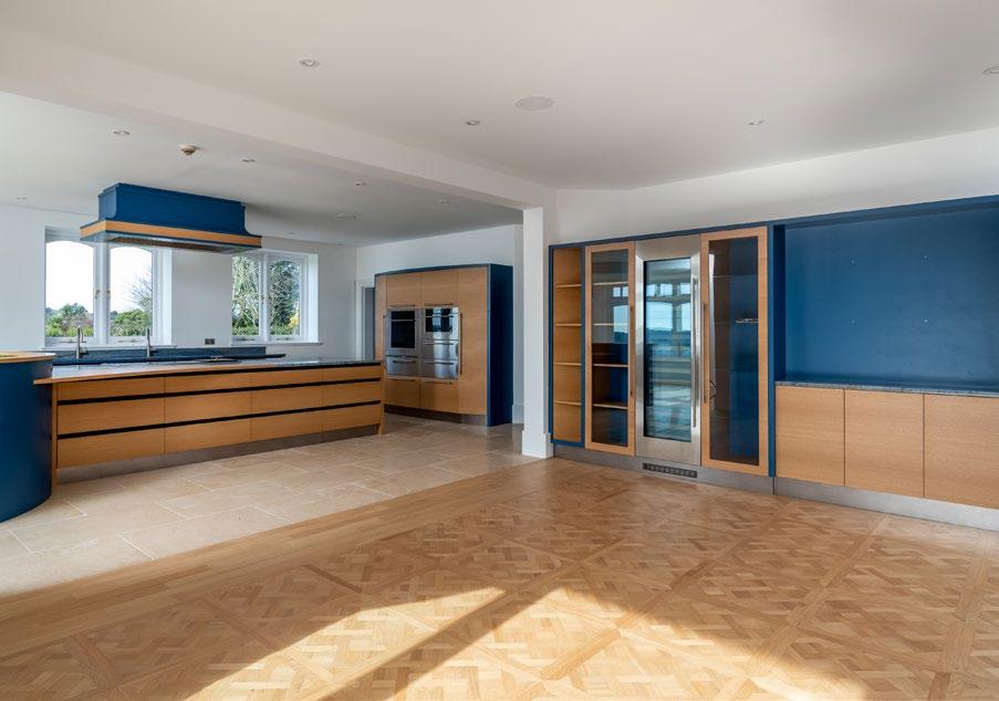 The new extensive open plan kitchen, breakfast and sunroom leads out on to the lawn where one can survey 180 degree panoramic views. A formal dining area and drawing room with double height windows/ doors open out on to the large south terrace and lawns. There is also a large entertainment/cinema room with bar and a large office/study.