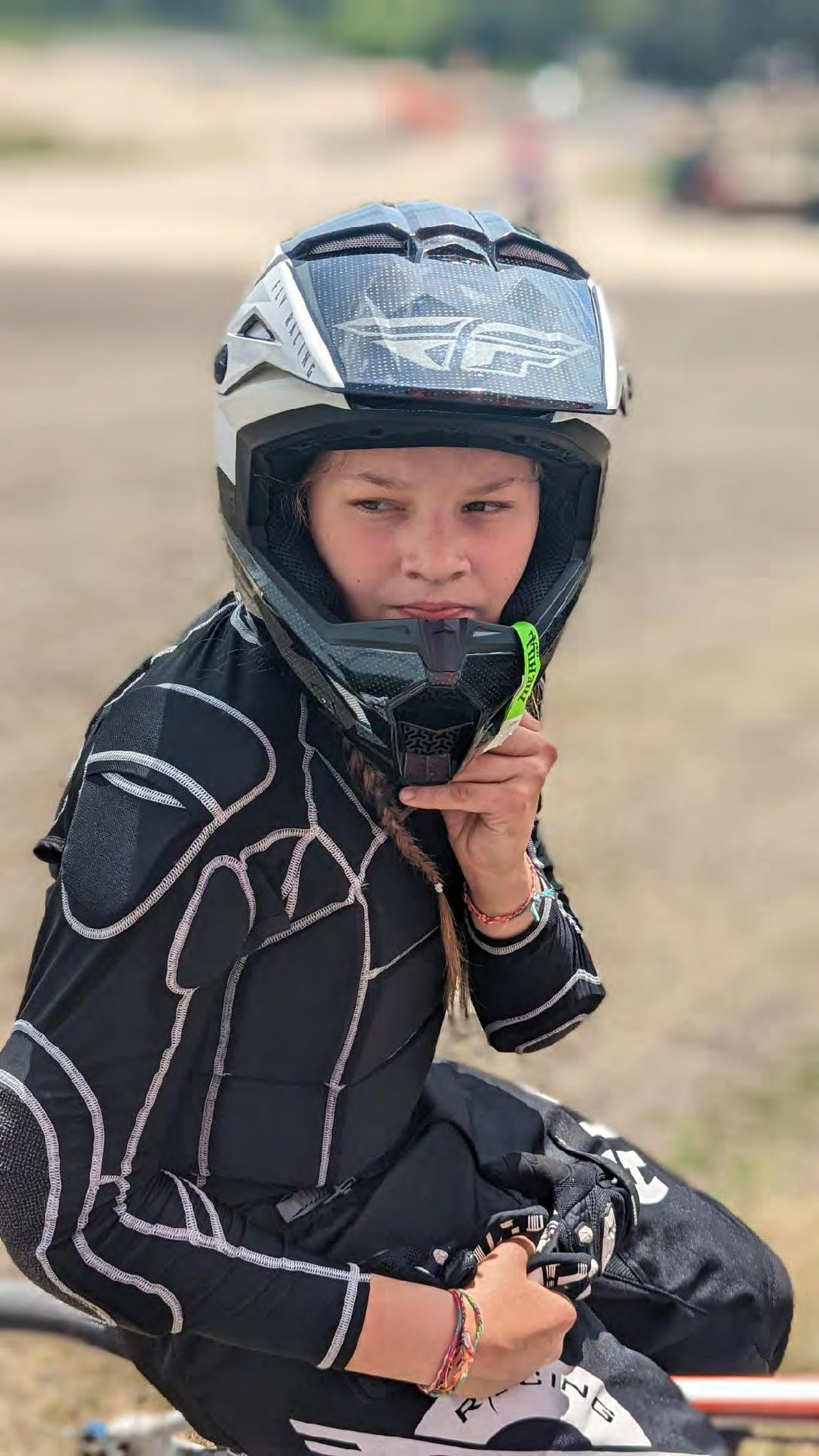 Nicky Tindle staring down at the ground, thinking about which BMX race move to perform next.