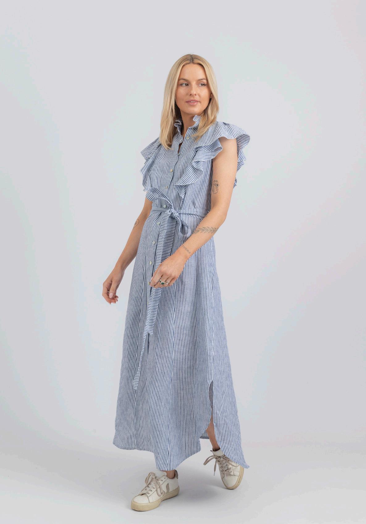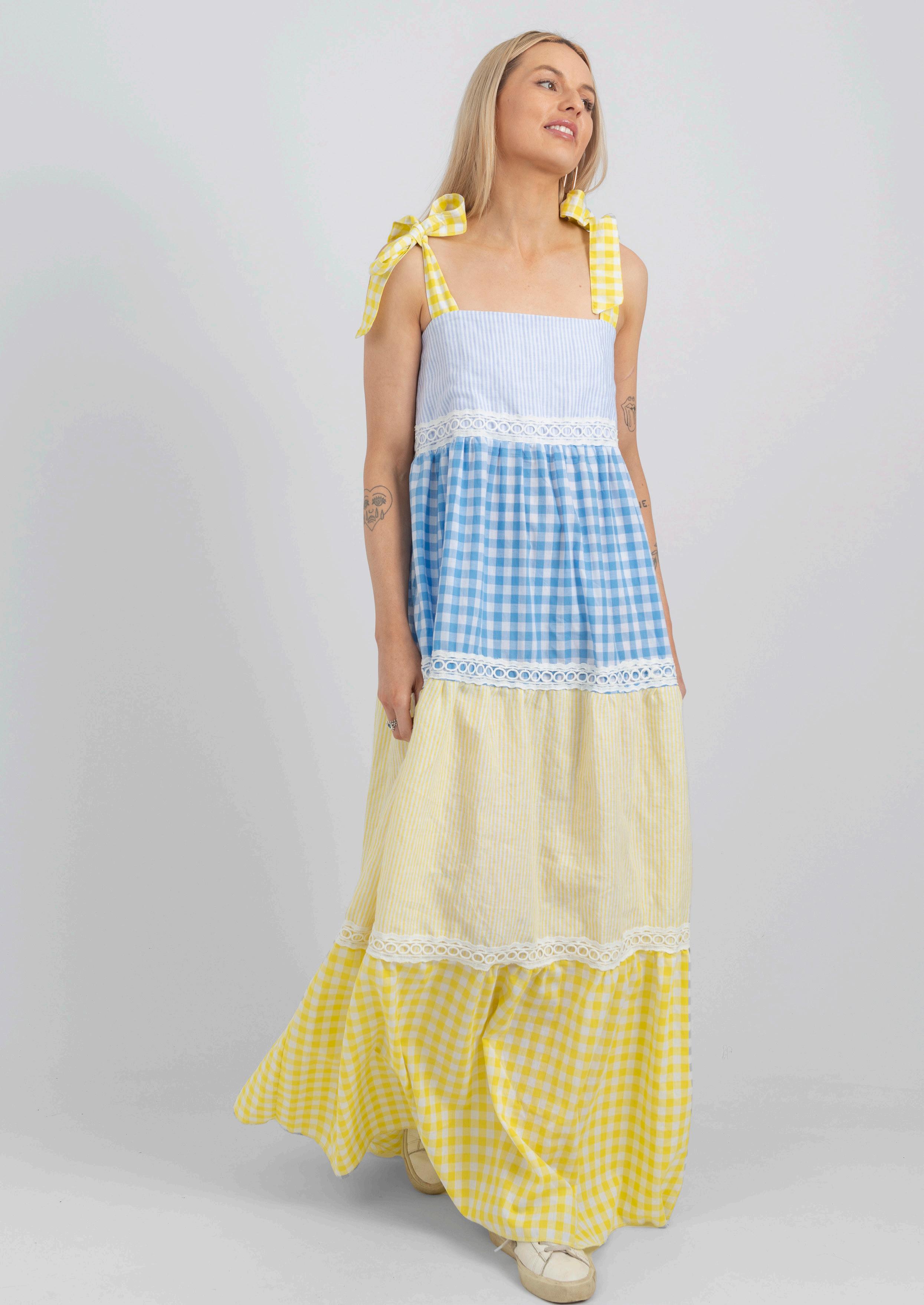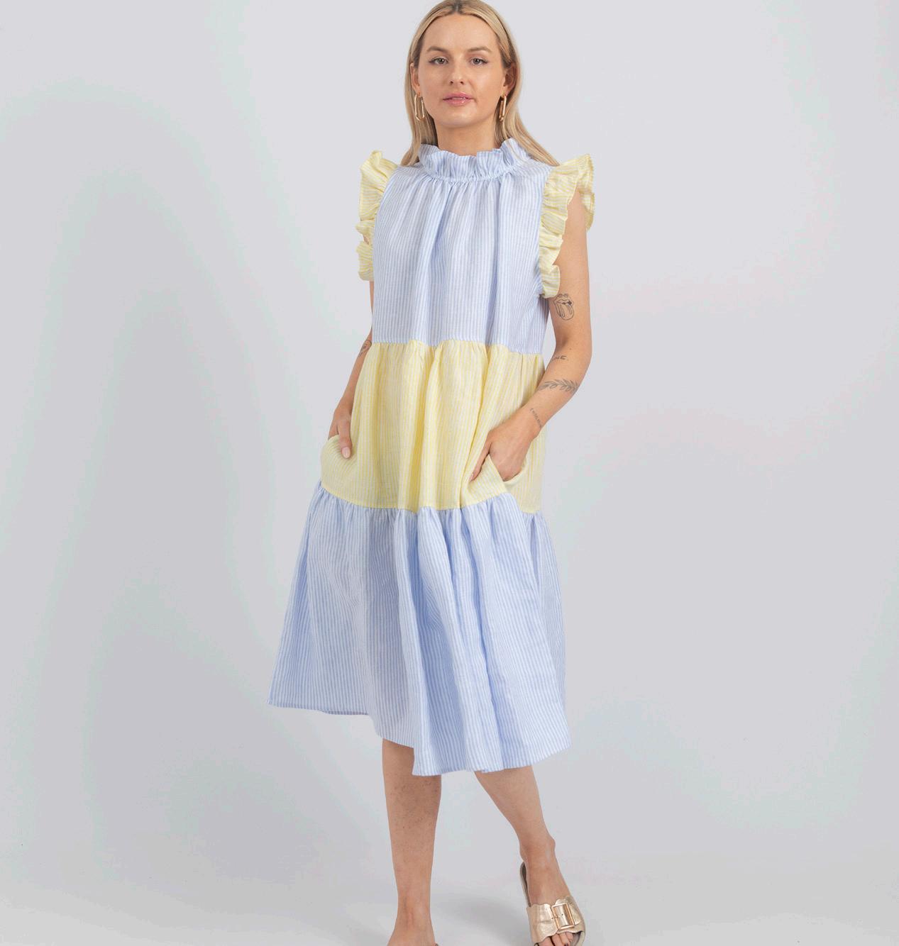 THIS PAGE Maxi Tie Dress Yellow Blue Stripe, $329