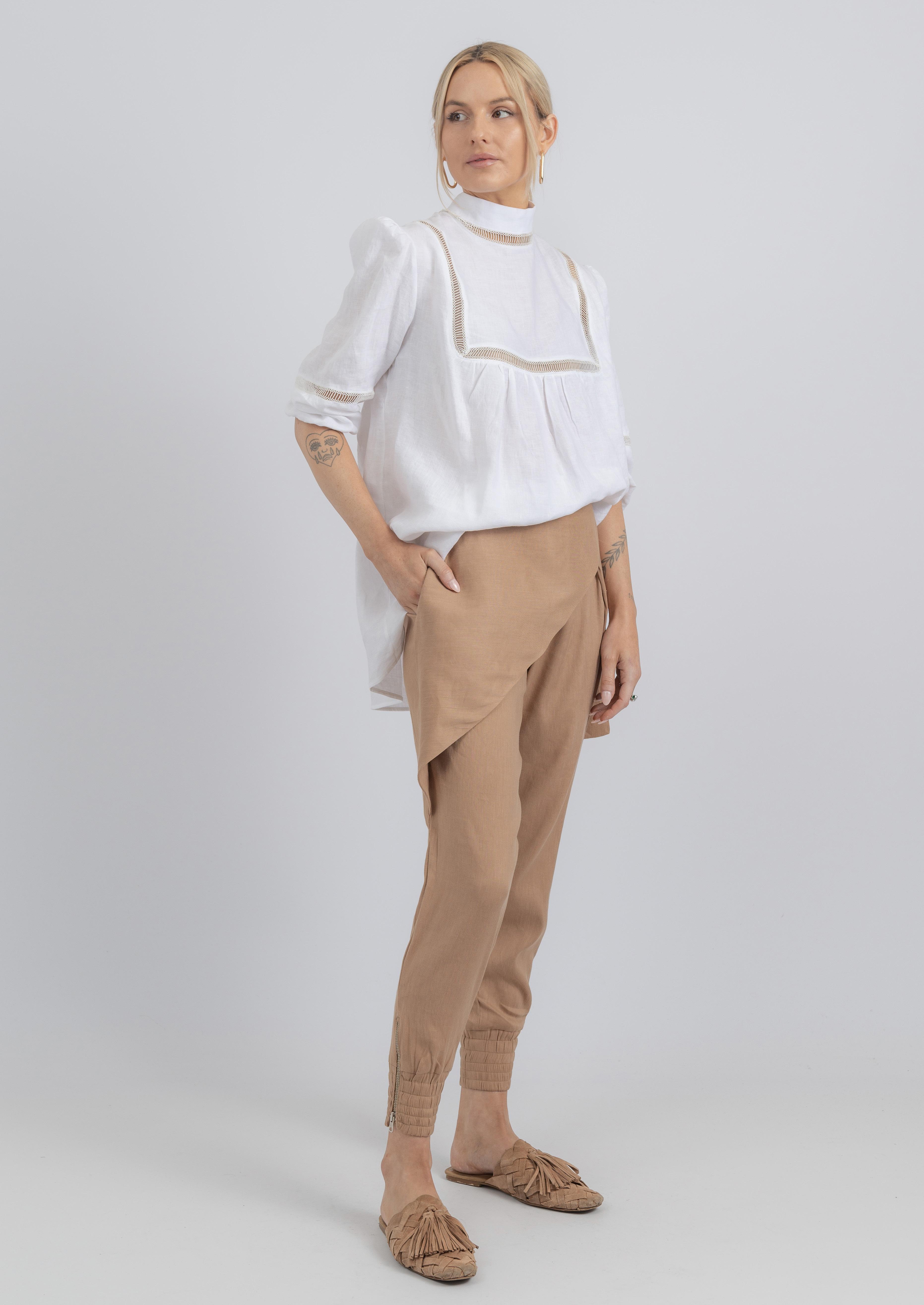 Bib Top White Linen Ladder Lace, $279 Mock Wrap Pant Caramel, $259