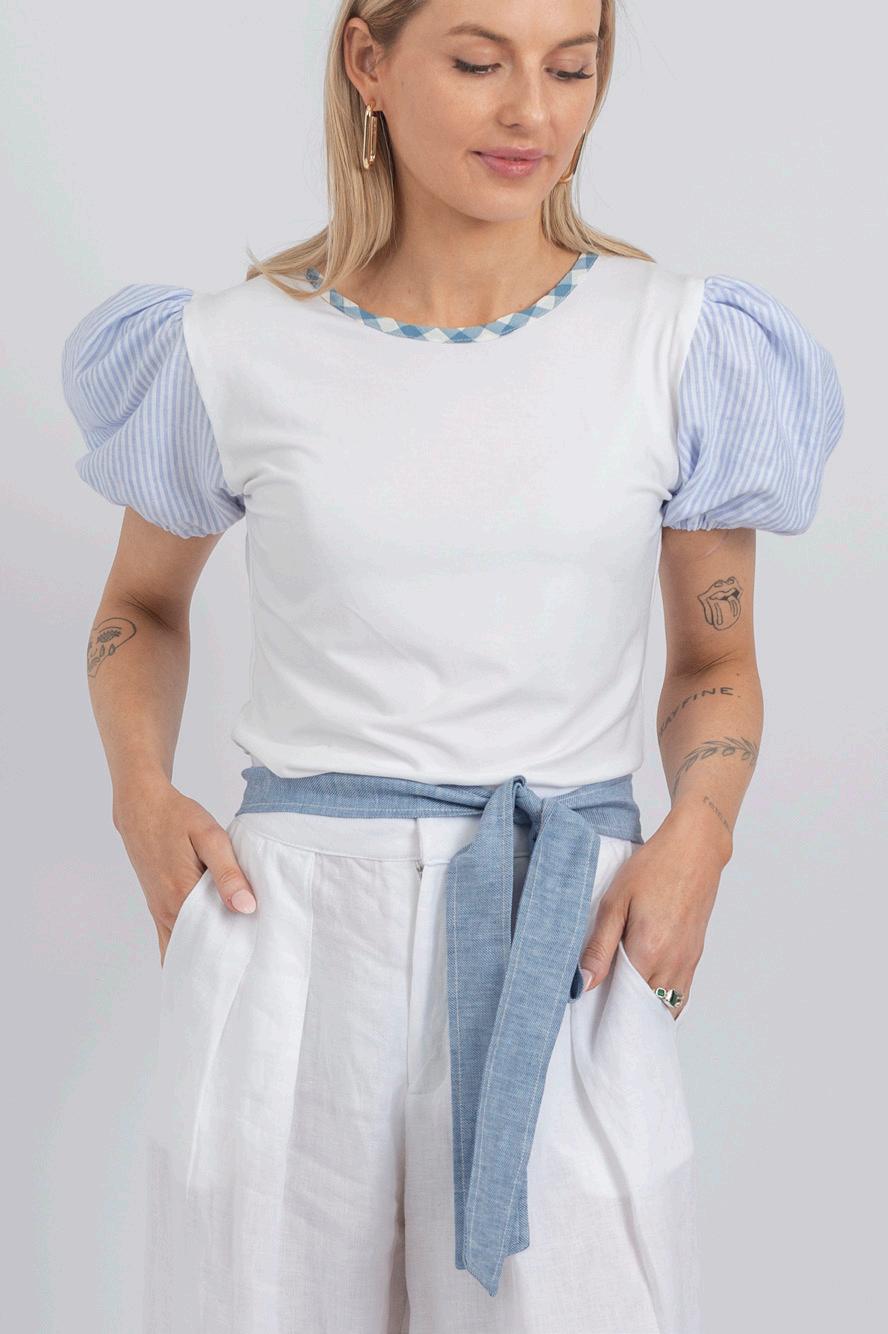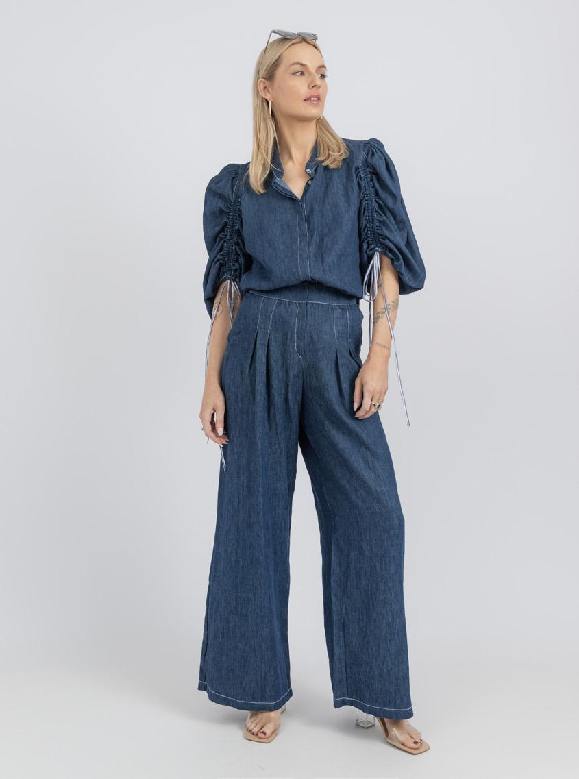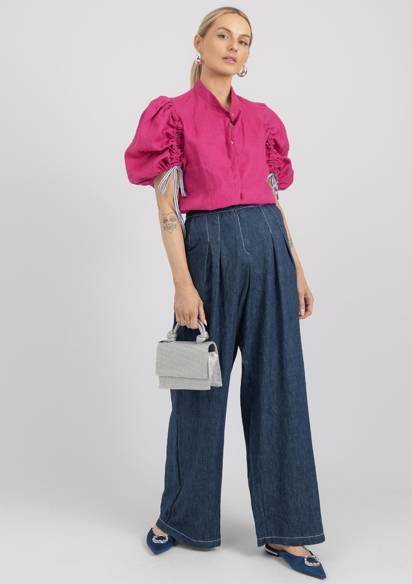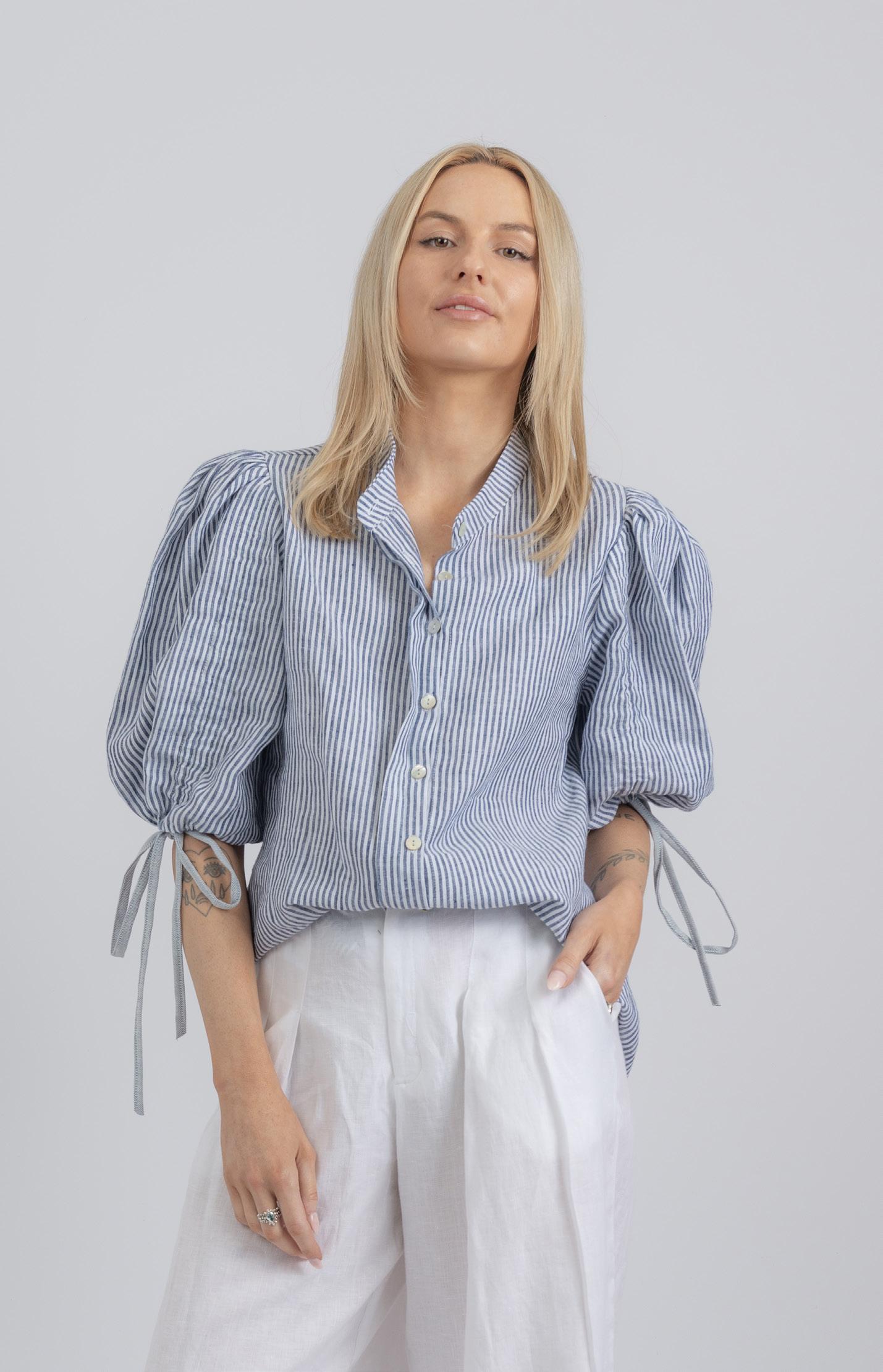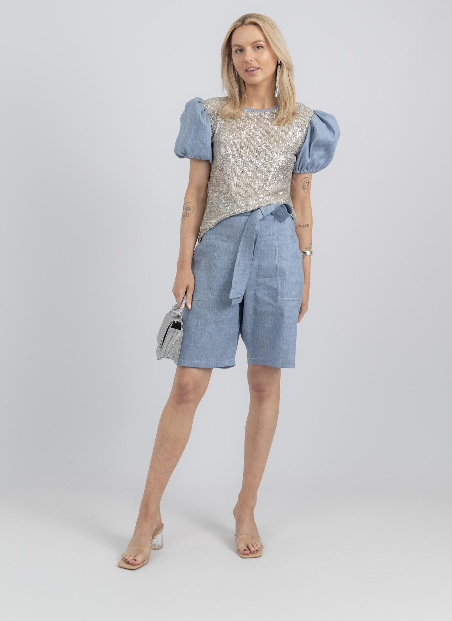 Puff Sleeve Top Silver Sequin Blue Wash Linen, $199