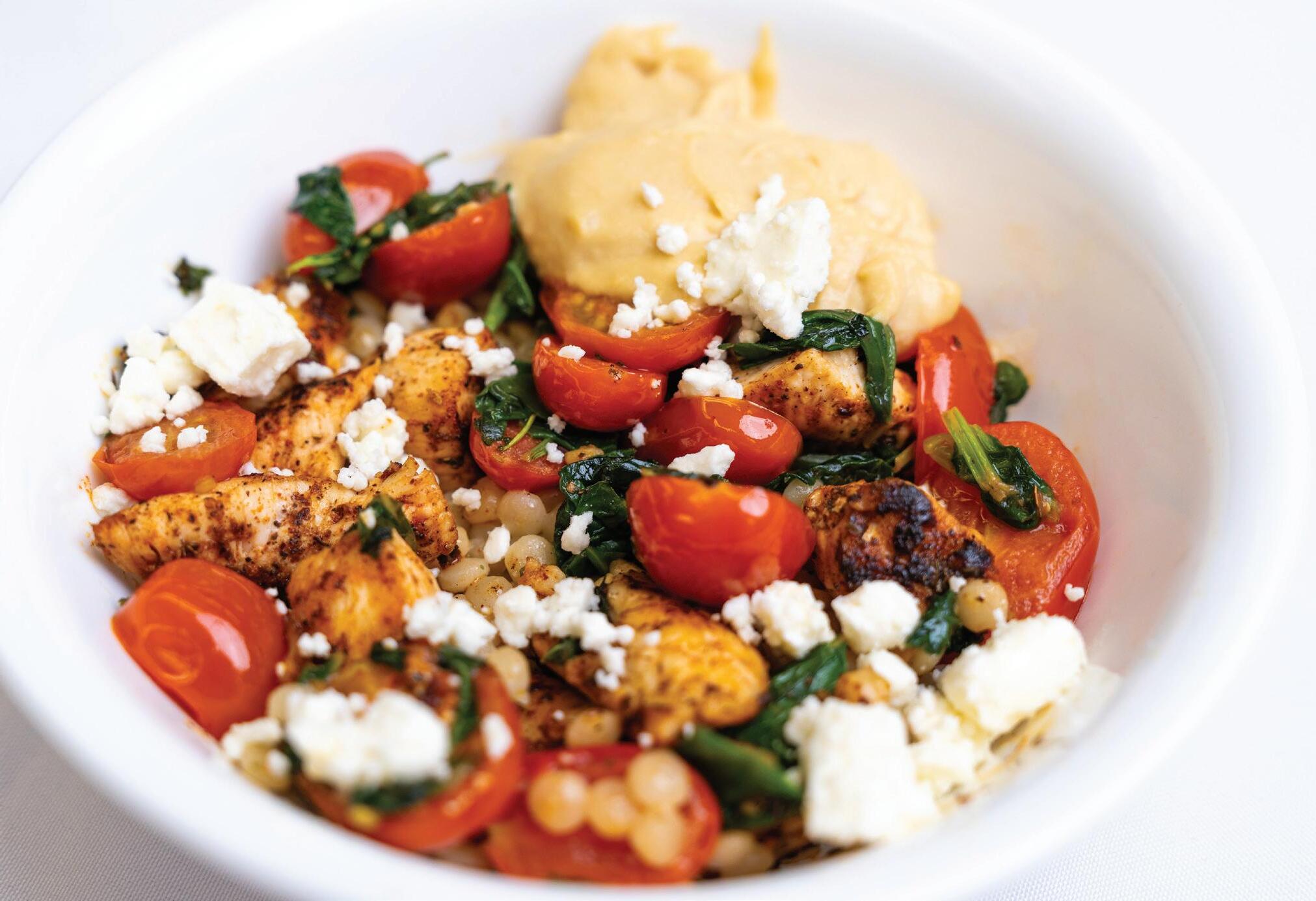 Transfer the pearled couscous to two serving bowls. Add the chicken-vegetable mixture. Top with feta cheese and hummus. Enjoy!