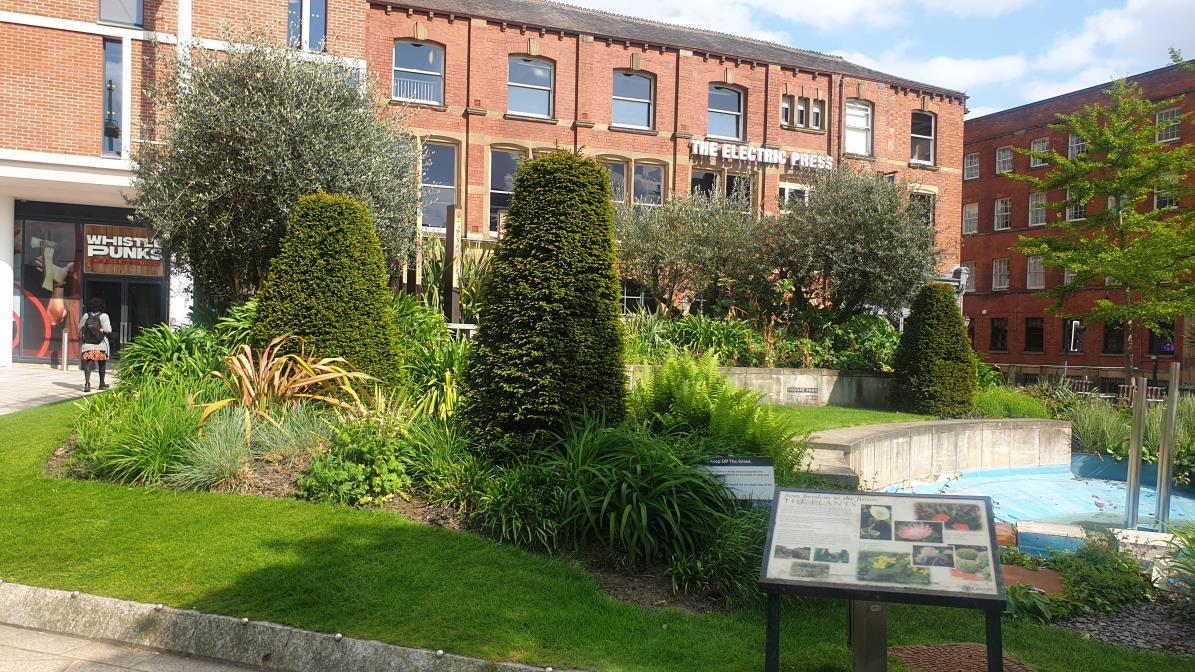 Detailing of hard landscape materials, which includes yorkstone and granites, combine to form pathways, steps, combine planting communities, flower beds are planted with plants native to Britain and South Africa while the water sculpture is said to be symbolic of the bars of Nelson Mandela’s prison cell. - all of which are further complemented a Hidden Nature, Hidden History corner of busy Leeds