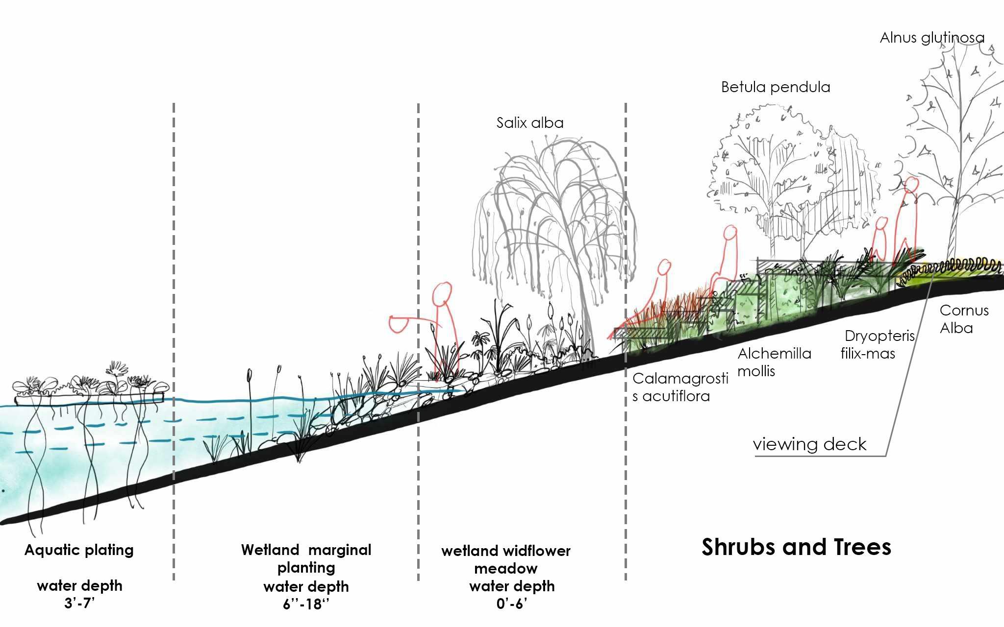 The soft landscape proposals largely focus upon the mass planting of wetland and wildlfower meadow habitats. This new area are highly important for the enhancement of the ecological framework. The establishment of wetlands and open wildflower meadows is sure to complement local ecology valua for the benefit of biodiversity and people alike.