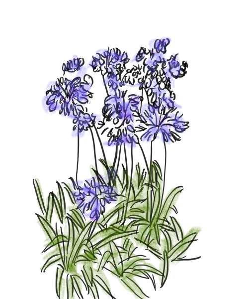 By this time, the garden was filled with purple African liLy. Purple and white flowers bloom in spherical shape, growing among other flowers and plants and planting borders under the shade of olive trees, creating a unique atmosphere for the garden in July