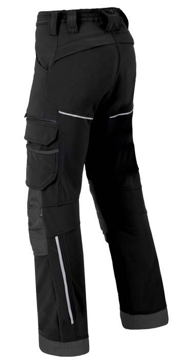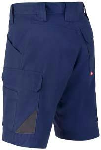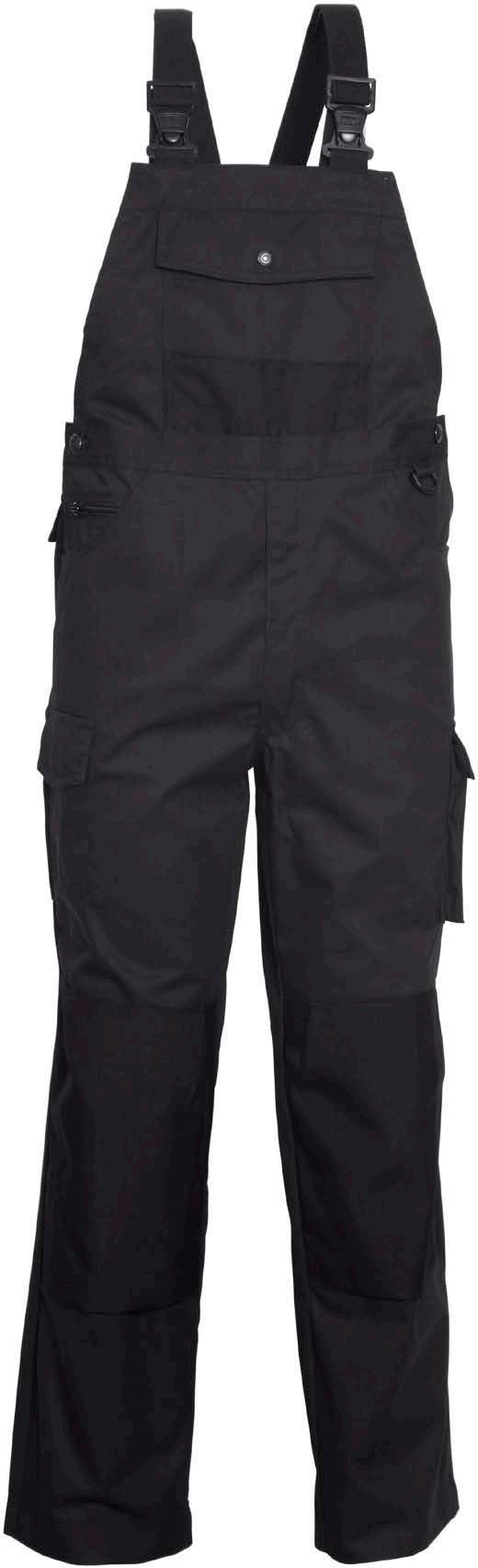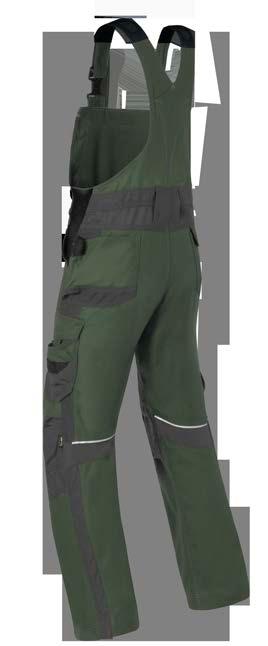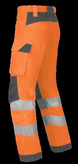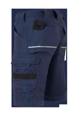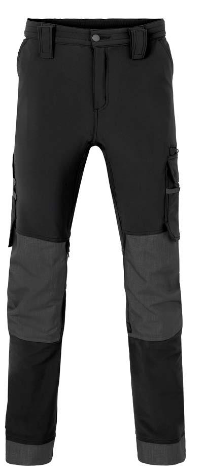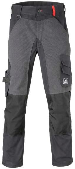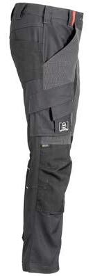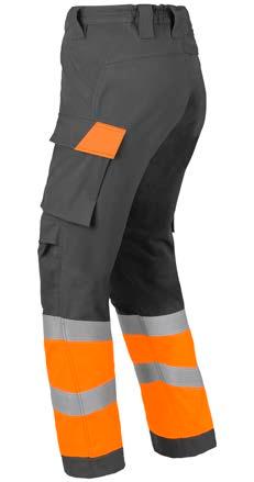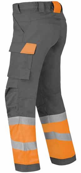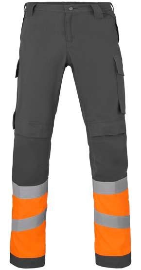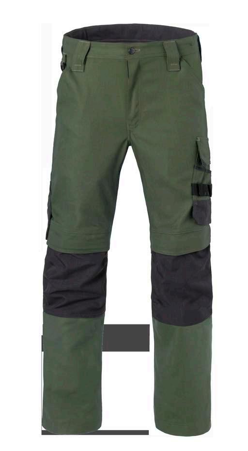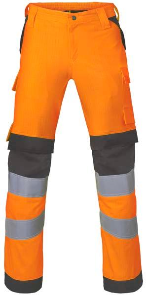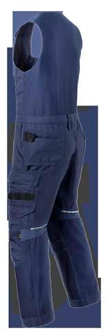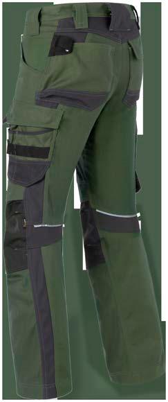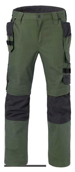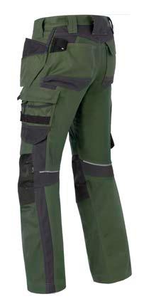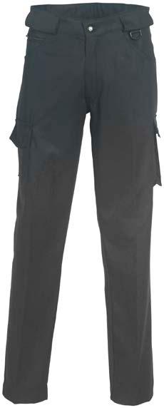 Omschrijving: verdekte ritssluiting, 2 ingezette zijzakken, 2 achterzakken waarvan 1 met knoop, duimstokzak, dijbeenzak met klep, kniezakken, elastiek in rug