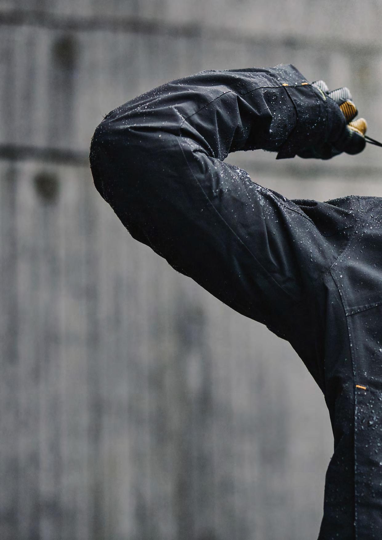 De buitenlaag is je barrière tegen wind en regen. Een waterafstotende jas houdt je droog, tenzij je urenlang in de stromende regen werkt. In dat geval heb je een waterdichte jas met getapete naden nodig om water buiten te houden. Bij winterse temperaturen moet je kiezen voor een isolerende en waterafstotende buitenlaag met hoge hals en verstelbare capuchon en manchetten.