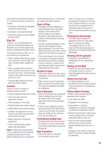 • When a player after a turnover • Players are not permitted to dive has occurred runs around or over Restart of play on the ball; a free kick will be the spot “the mark “where the ball • After every major score (6), play is awarded against the player diving made contact with the ground due on the ball restarted in the centre of the field to the turn over via a ball up Away from the ball • The ball after being kicked has • After a minor score (1 point) the • An opposing player is not been touched in transit ball is required to be kicked back permitted to touch a player (touch) into play from between the goals unless the player is in possession Contact by a defender of the ball There is to be no contact or spoiling, players cannot: Out of Bounds Fifteen Metre Penalty • Hold an opponent with their hands • When the ball goes out of bounds (ball completely over the line) • Knock the ball out of an by hand or foot, the nearest opponent’s hands opponent shall kick the ball back • Push the player in the side into play • Steal the ball from another player • If there is any doubt as to which • Deliberately bump another player • Smother an opponent’s kick by trying to block the kicking motion at the point of impact. • Barge, fend off or shepherd opponents • Touch the ball while another player has possession Note: It should be accepted that it is very difficult to limit incidental contact whereby two or more players attempt to pick up the ball