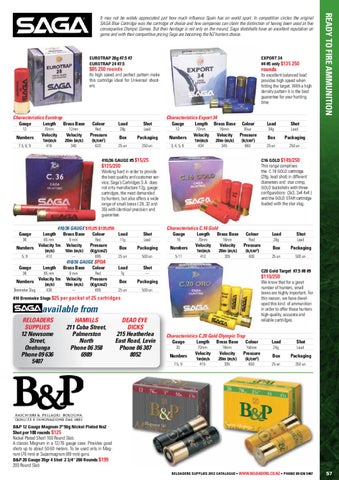 B&P 12 Gauge Magnum 3" 50g Nickel Plated No2 Shot per 100 rounds $125 Nickel Plated Shot! 100 Round Slab. A classic Magnum in a 12/76 gauge case. Provides good shots up to about 50-60 meters. To be used only in Magnum (76 mm) or Supermagnum (89 mm) guns. B&P 20 Gauge 35gr 4 Shot 2 3/4” 200 Rounds $199 200 Round Slab REloaders Supplies 2012 Catalogue • www.reloaders.co.nz • phone 09 636 5407