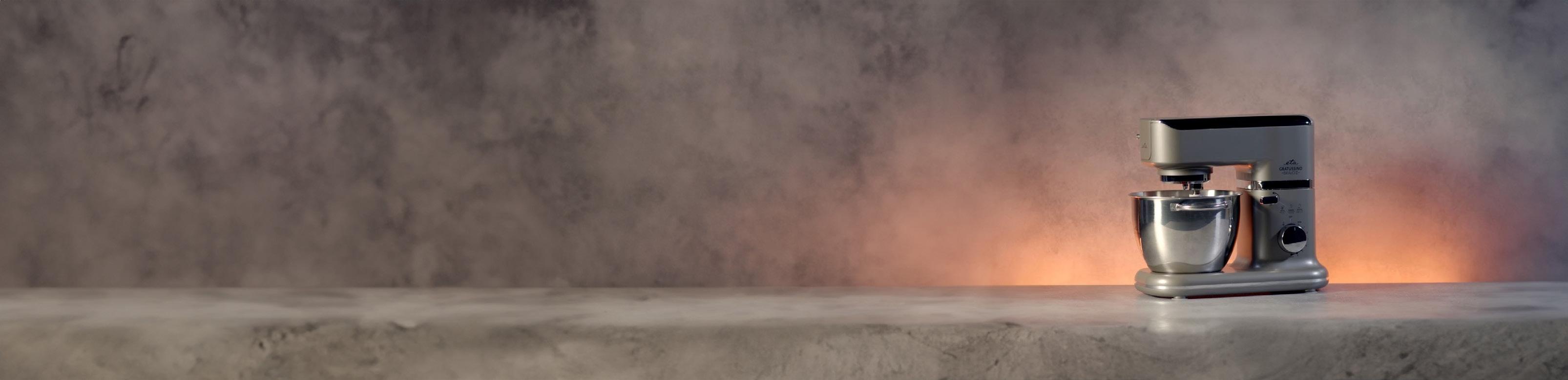 Matvinnsluvél. Aflmagn 800 W. Samfelld hraðastýring, 4,5 l ílát. Margnota notkun: Hnoða, þeyta, blanda, mala kjöt, rífa, blanda og fylla á pylsur. Varmaöryggi, ljósmerki notkunar. Aukabúnaður. Má þvo í uppþvottavél. 1,2 m snúra. 1851421