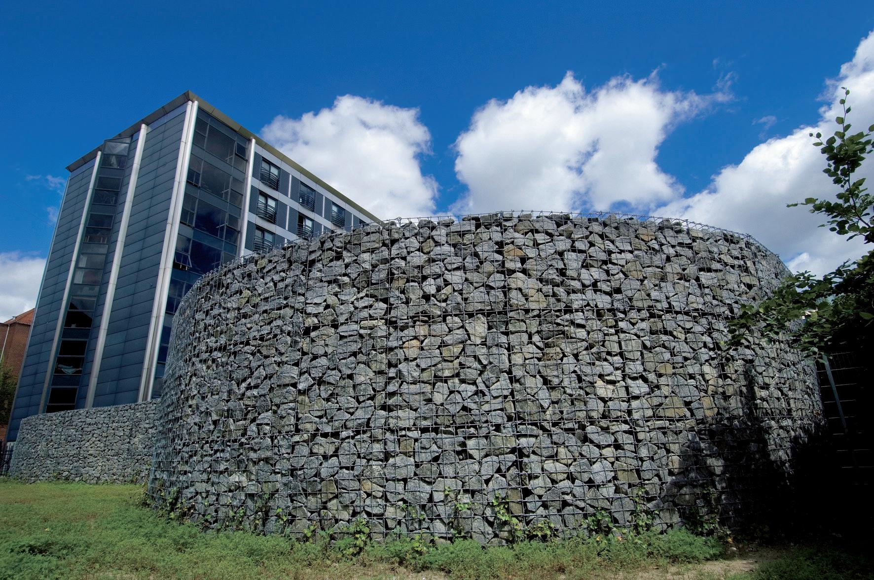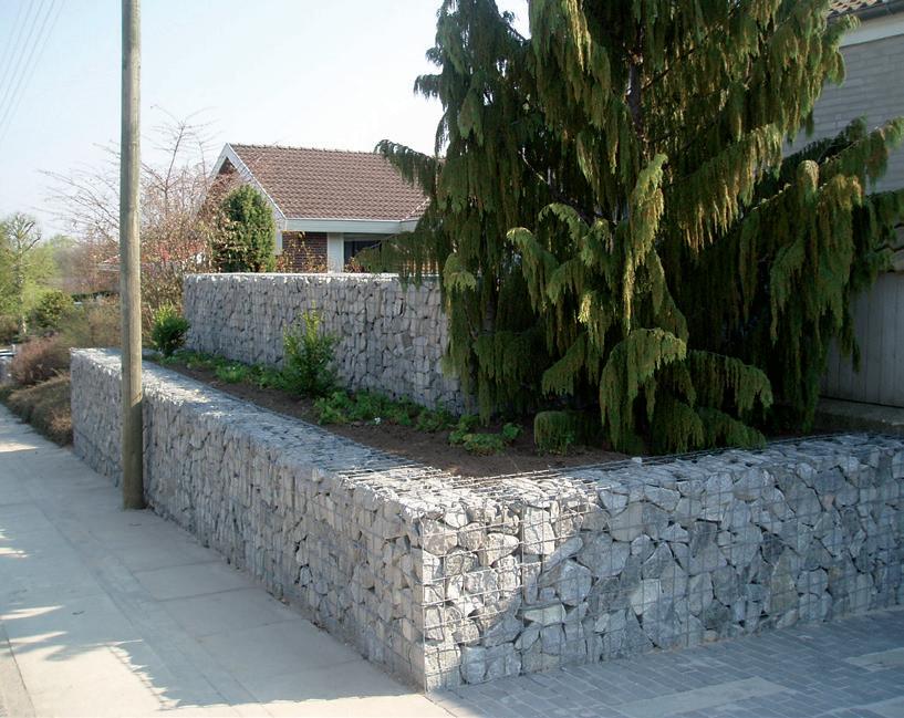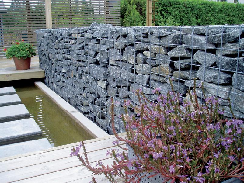 sjálfstæða skjólveggi í allt að 180 sentímetra hæð. Það er fyrst og fremst þyngdin sem heldur veggnum á sínum stað. Einn rúmmetri af svona vegg vegur á bilinu 750 til 900 kíló. Í raun er hægt að nota hvaða jarðefni sem er í fyllingu, en veggi sem á að nota sem stoðveggi og eiga að vera hærri en 1 metri á að fylla með grjóti. Það er erfiðara að fá fallega áferð með stærri steinum, og því er mælt með steinastærð á bilinu 100 til 200 mm til að fá fallega áferð.