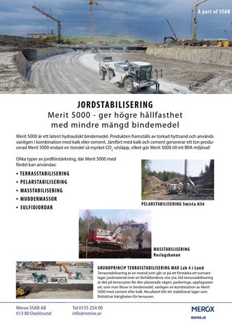 Merit 5000 - ger högre hållfasthet med mindre mängd bindemedel Merit 5000 är ett latent hydrauliskt bindemedel. Produkten framställs av torkad hyttsand och används vanligen i kombination med kalk eller cement. Jämfört med kalk och cement genererar ett ton producerad Merit 5000 endast en tiondel så mycket CO2-utsläpp, vilket gör Merit 5000 till ett BRA miljöval! Olika typer av jordförstärkning, där Merit 5000 med fördel kan användas: