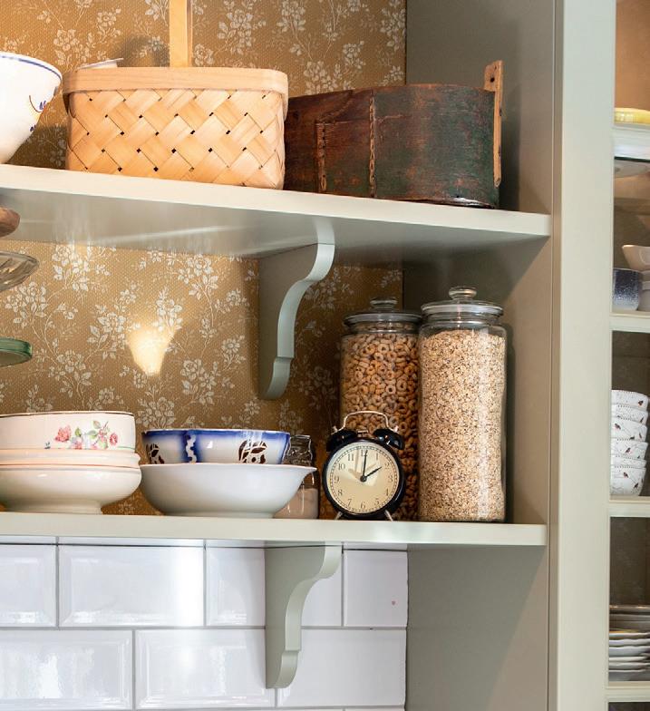 For å ivareta Kornells linjer og design kommer denne fronten kun til moduler under benk og til høyskap. Om du ønsker overskap, kombineres gjerne Kornell med Pesto eller Dill, eller som vist her med vår nye vitrineserie.
