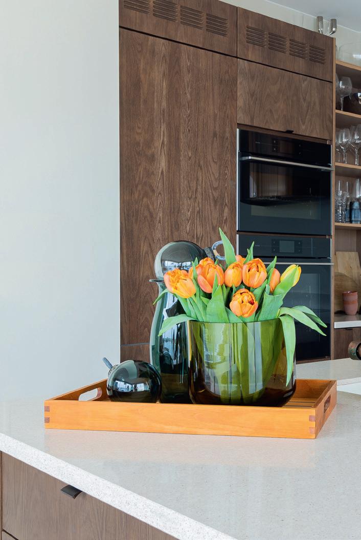 – Jeg liker gode kvalitet og at ting varer. Benkeplaten i kompositt, for eksempel. Den er lett å vedlikeholde og holde ren, samtidig som den ser lekker ut. Jeg trakk benkeplaten litt opp på veggen bak stekesonen for å få helheten jeg ønsket, meg samtidig som det er praktisk i forhold til matsøl.