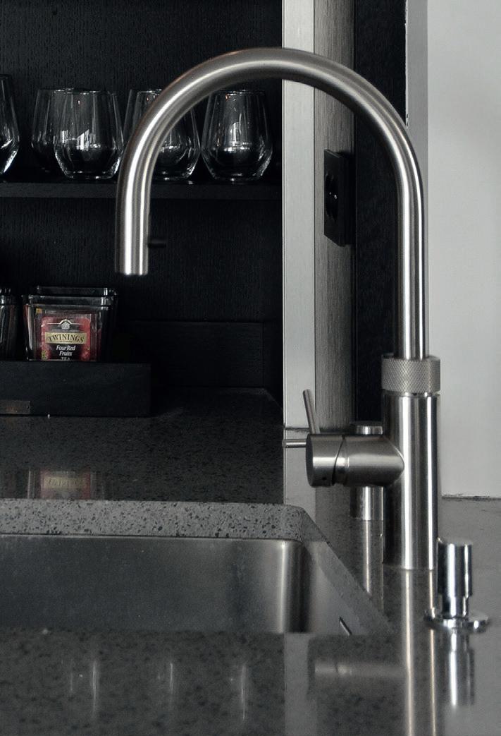 Det blir servert nykvernet kaffe på øya i smekre kopper fra integrert kaffemaskin på veggen. Alt i sort og stål.