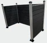 Anodiserede sølvfarvede aluminiumsstolper. Plankerne er antracitgrå med træstruktur.