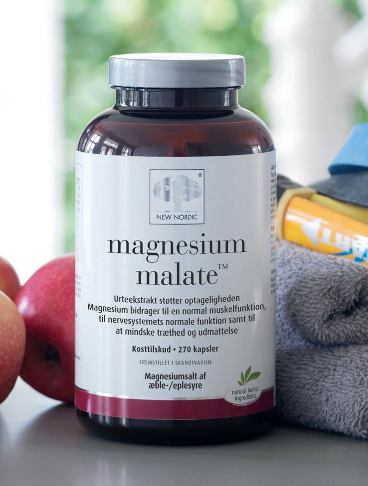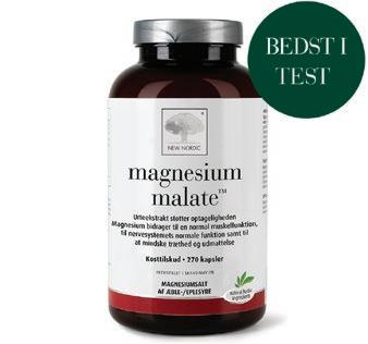 Magnesium Malate™ fra New Nordic® fik en suveræn førsteplads blandt 8 magnesiumpræparater på Forbruger-Test. dk. Kapslen indeholder magnesiumkilden magnesiummalat. Magnesiummalat er en organisk bundet magnesiumkilde bundet til æblesyre. Magnesium bidrager til normal muskelfunktion, et normalt nervesystem samt bidrager til at mindske træthed og udmattelse og til at vedligeholde normale knogler og tænder. Magnesiummalat kapslen er yderligere sammensat med fransk maritim fyrrebark og lang peber. Maritim fyrrebark forbedrer mikrocirkulationen ved at øge kapillærpermeabiliteten og lang peber støtter optageligheden af andre urter.