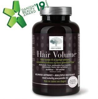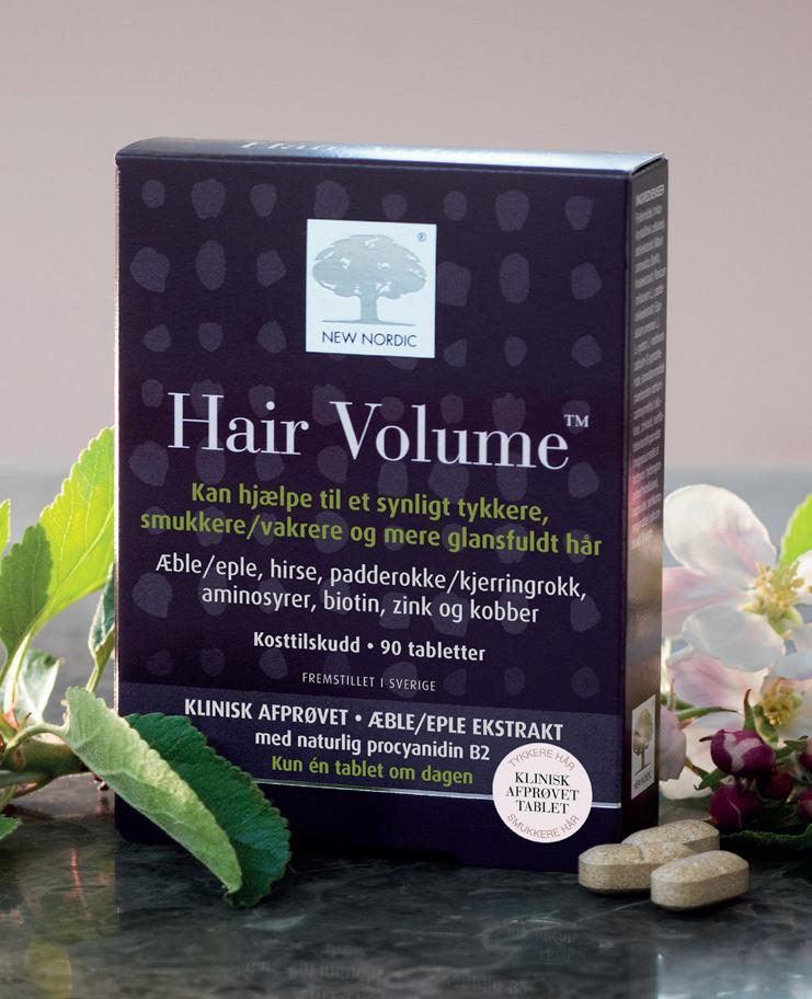 Flere og flere opdager fordelen ved Hair Volume. Et dansk udviklet kosttilskudspræparat, der har været på markedet i mere end 13 år. Vær opmærksom på, at du får den gode og klinsk afprøvde hårtablet, der hedder Hair Volume. Du kender den på det karakteristiske ”Sølvtræ” mærke fra New Nordic®, der sidder foran på æsken.