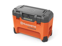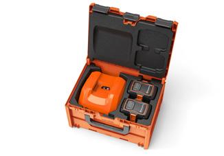 HUSQVARNA 40-B330X/ 40-C500X POWER KIT Robuste und dennoch leichte sowie handliche Transportbox, die zwei 40-B330X-Akkus und ein 40-C500X-Schnellladegerät enthält.