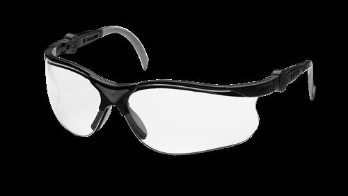 Schutzbrille mit kratzfesten, klaren sowie anwinkelbaren Gläsern und ausziehbaren Bügeln. Entspricht den Bestimmungen gemäß EN 166, Ansi Z87+.