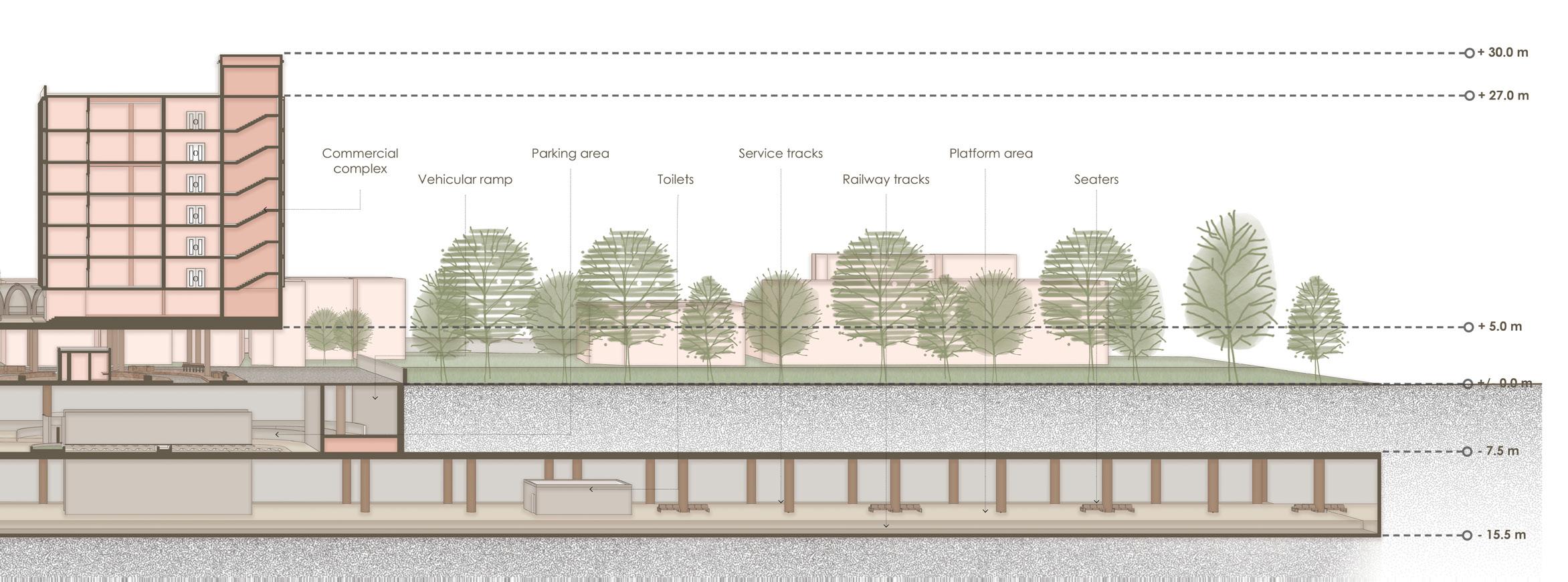 I Hussain Lakdawala I Sem IX - X I Design Dissertation I Rizvi 125 Services room Commercial complex Railway tracks Central atrium Toilets Kids play area Parking Lane Food stalls Seaters Admin block Dual way ramp Cafeteria - 15.5 m - 7.5 m +/- 0.0 m + 5.0 m + 8.0 m + 27.0 m Waiting room Shops Escalators and lifts Parking area Bus stand Commercial complex Seaters - 15.5 m - 7.5 m +/- 0.0 m + 5.0 m + 9.0 m +12.0 m +15.0 m +18.0 m + 21.0 m + 24.0 m +27.0 m