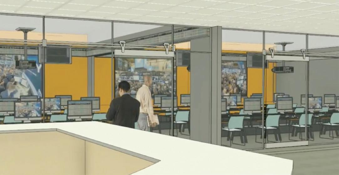 In addition, the Ronan Center for Financial Technology contains two financial market “walls” that allow students to see the impact breaking news has on the financial markets. Also included are four world clocks that show the time in New York, London, Dubai and Beijing.