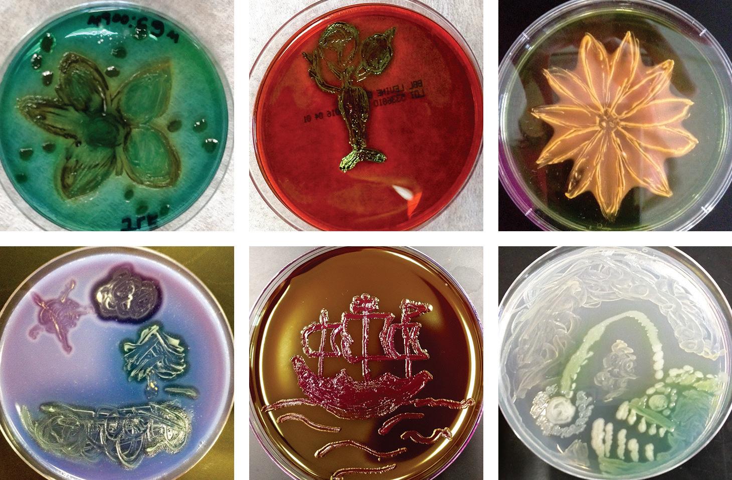 Students in SL 241 Microbiology Lab and SL 399 General Microbiology Lab participated in a contest where they drew works of art in bacteria on petri plates. Students drew upon research into what color different species of bacteria will grow on different types of media. Entries were rated upon complexity, design, and how many species of bacteria they incorporated. Images of selected plates are shown.