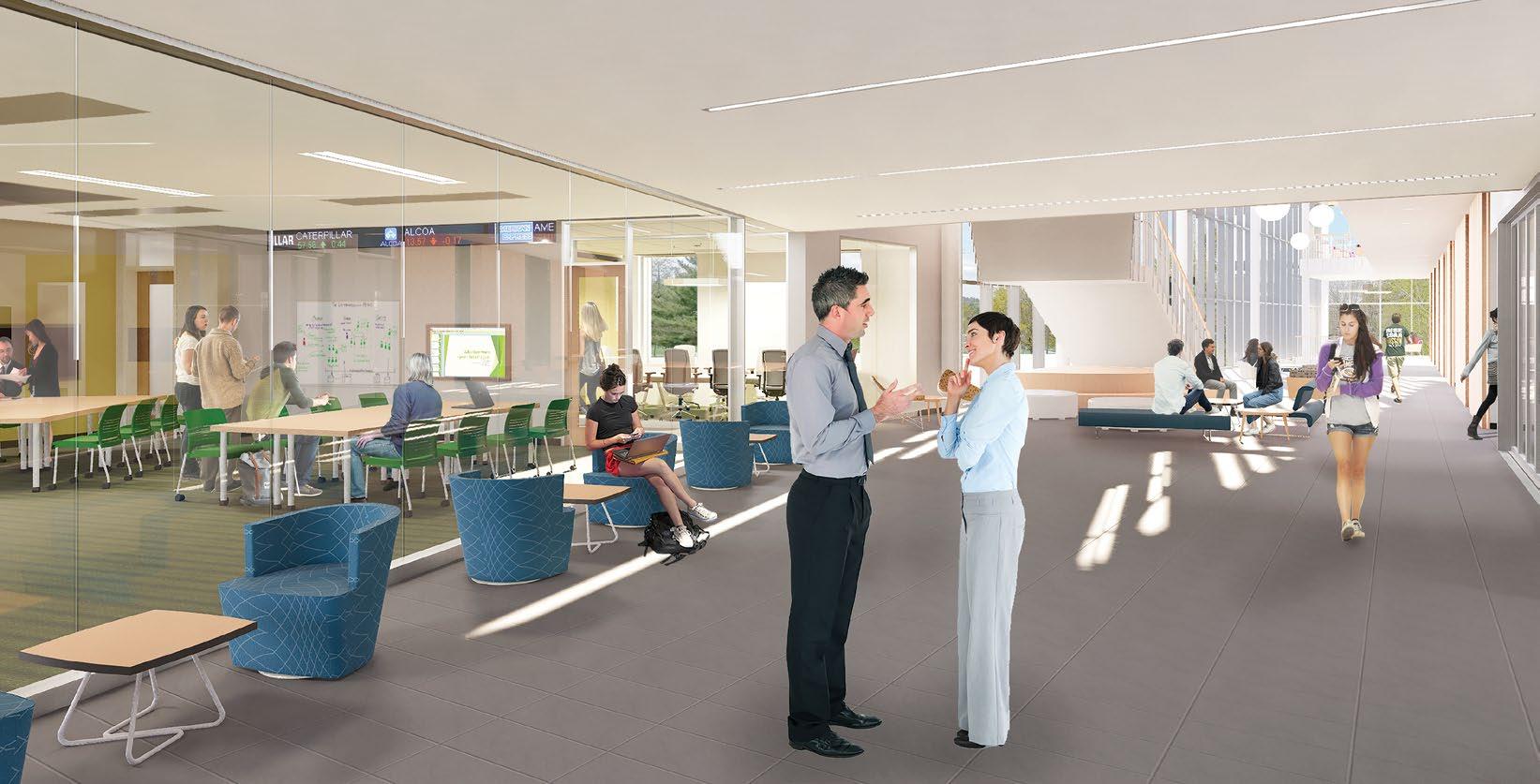 Faculty offices will be grouped into four “neighborhoods” representing each of the four schools. “The new building which includes more ’student space’ will allow for greater interaction between students and faculty,” says John Michaud, Director and Assistant Professor of the School of Legal Studies. “I believe that the new building will significantly help with recruiting more students to the College of Business and its four schools.”